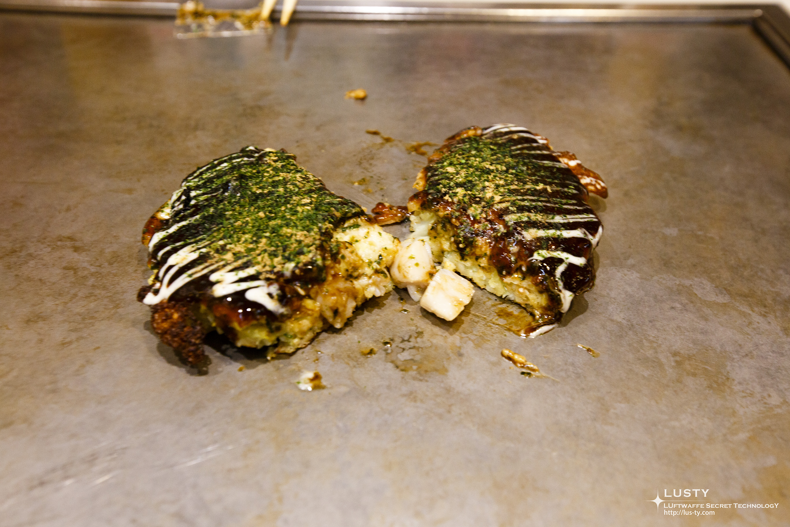 오코노미야키는 돼지고기와 오징어, 새우, 문어, 관자가 들어간 시그니처 메뉴로 주문. 겉바속촉의 정석적인 텍스쳐를 가진 오코노미야키였다.