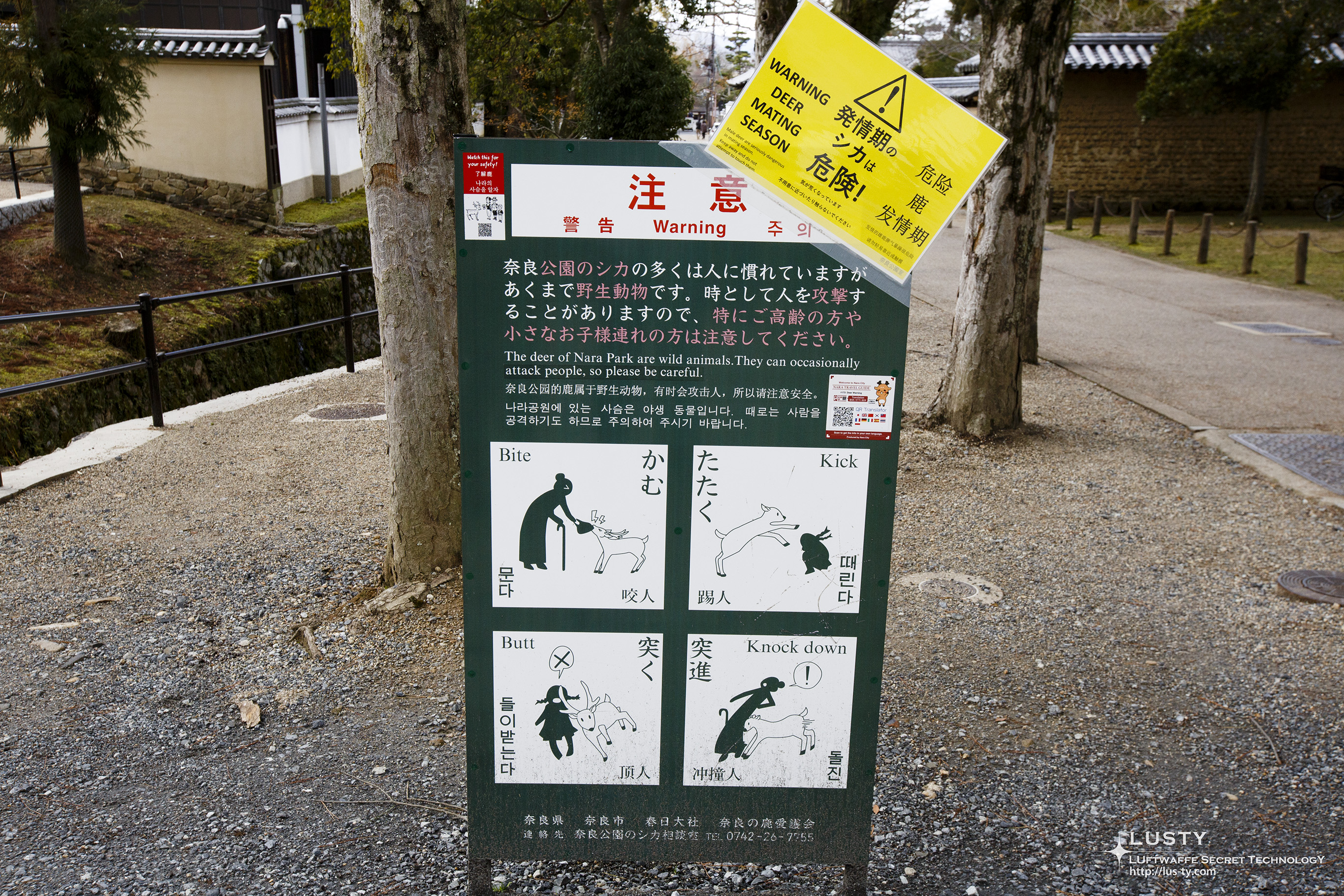 사슴의 공격성에 대해 주의시키는 표지판. 문다. 때린다. 들이받는다. 돌진! 하지만 역시 노란 표지에 써 있는 쪽이 더 눈에 들어온다. '발정기의 사슴은 위험!'
