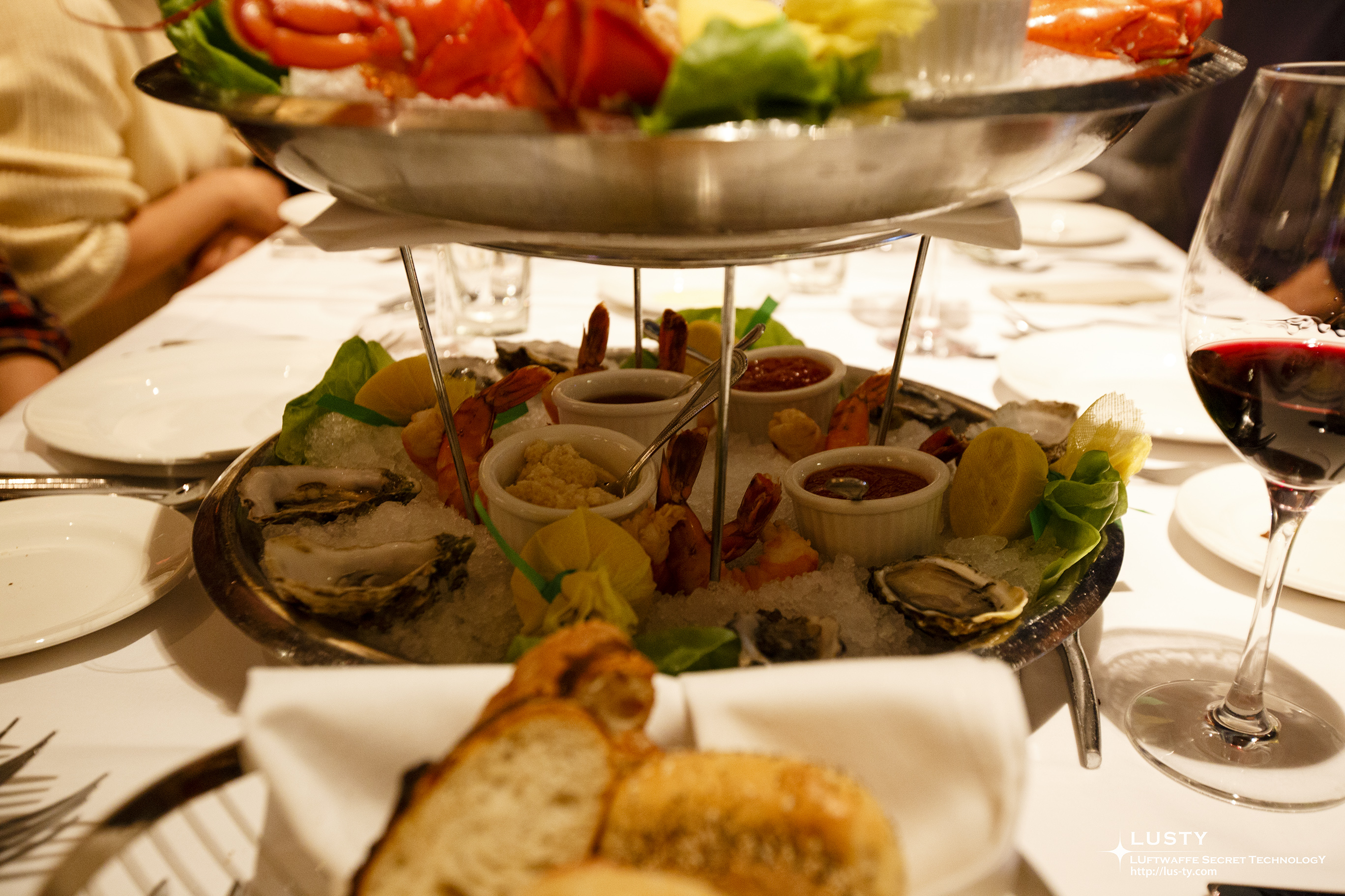 윗층은 게와 랍스터, 아래층은 굴과 새우가 플레이팅 되어 있다.
