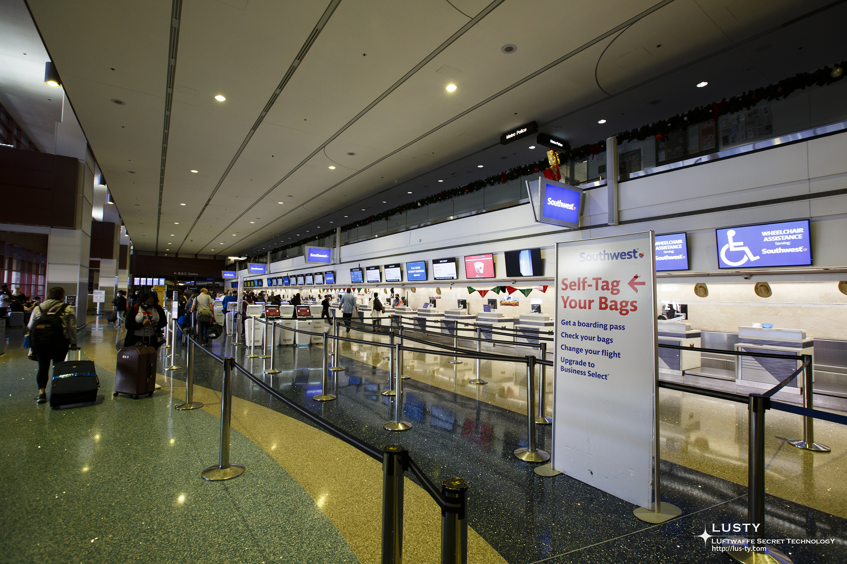 사우스웨스트 체크인 카운터. 기계에서 여권을 인식해서 항공권을 뽑으면 카운터에서는 백드롭만 할 수 있다. 사우스웨스트가 자리도 안 정해주고 탑승시키는 등 신기한 서비스를 많이 하고 있고, 짐 연결도 안 되는 항공사긴 하지만 화물 영업을 하지 않는 특성 상 수하물을 두 개까지 무료로 실어주기 때문에 국내선만 이용하는 경우는 확실히 매력이 있는 것 같다. 다만 오늘은...