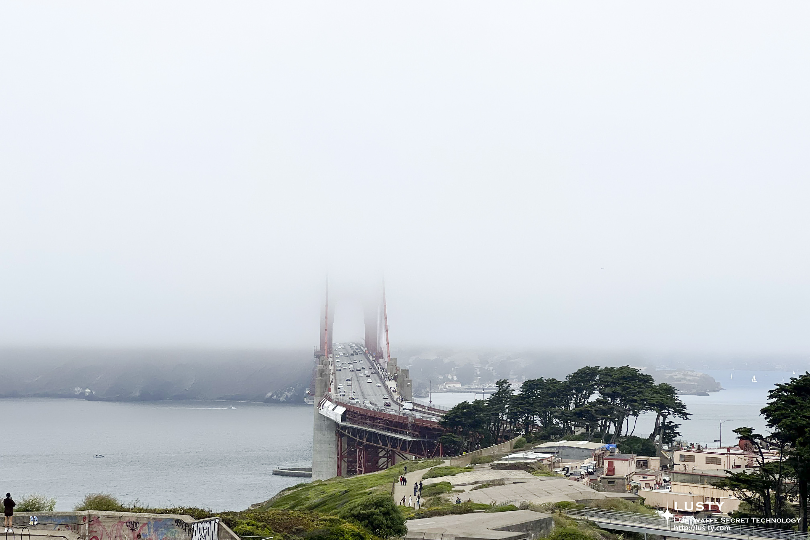 줌을 땡겨본 사진. 건너편 해안가는 보이는데 그 위는 구름으로 뒤덮여 보이지 않는다. 이 포인트에서 금문교의 좋은 사진을 찍은 사진이 많은데, 좋은 사진을 얻기 위해서는 상당한 운이 따라주어야 하는 것 같다.