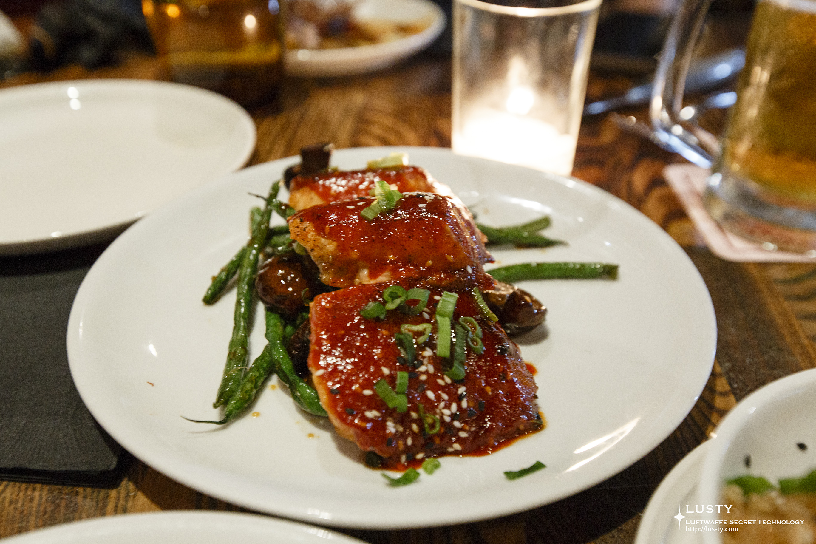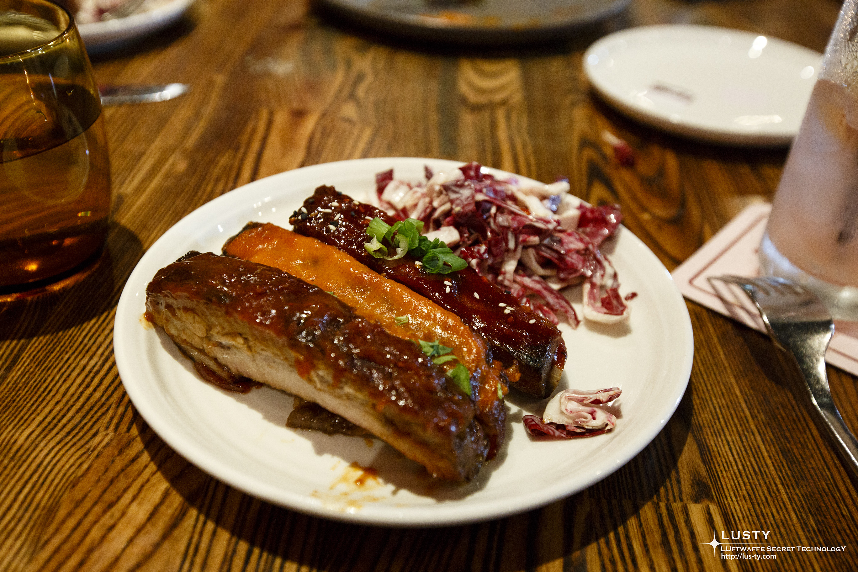 다음은 시그니처 립 트리오. 원래 코스 메뉴에 나오는 건 아메리칸 바베큐 립인데, 인당 8달러를 내면 멕시칸 치폴레, 코리안 고추장과 아메리칸 바베큐를 하나씩 맛볼 수 있다. 아메리칸 바베큐는 오리지널한 바베큐의 맛이었고, 치폴레는 살짝 매콤한, 멕시칸에서 느낄 수 있는 맛이 났다. 코리안 고추장이 제일 재미있었는데, 분명히 립을 뜯고 있는데 소스 덕에 고추장황태구이같은 맛이 나서, 분명히 이건 먹어본 맛인데 대체 어디서 먹어본 맛인지 생각해내느라 꽤 고민을 했다. 깨닫고 나서도 머리가 적응하기 좀 힘들어했지만, 어쨌든 신선한 시도였다고 생각하고 맛있었다.