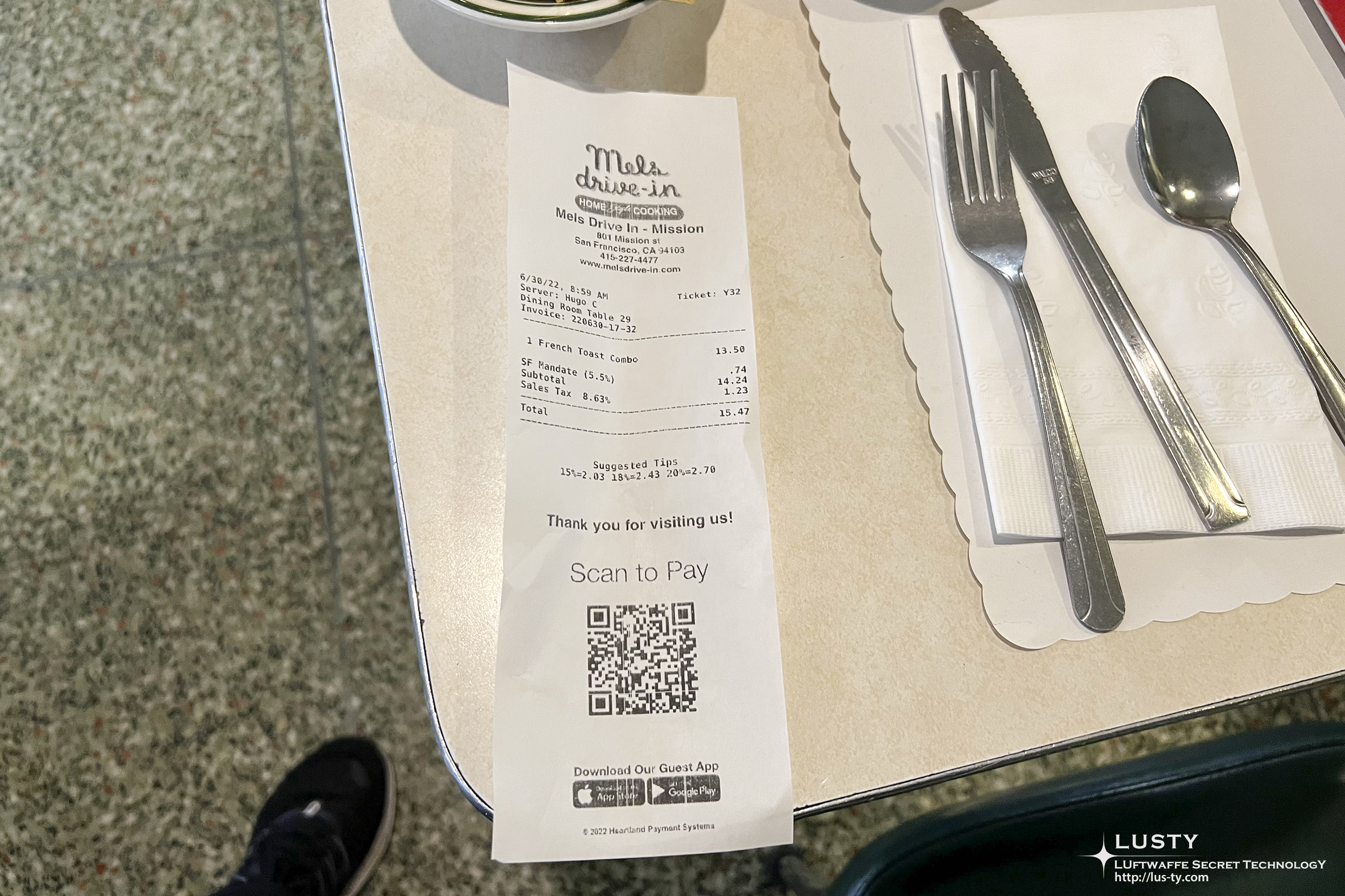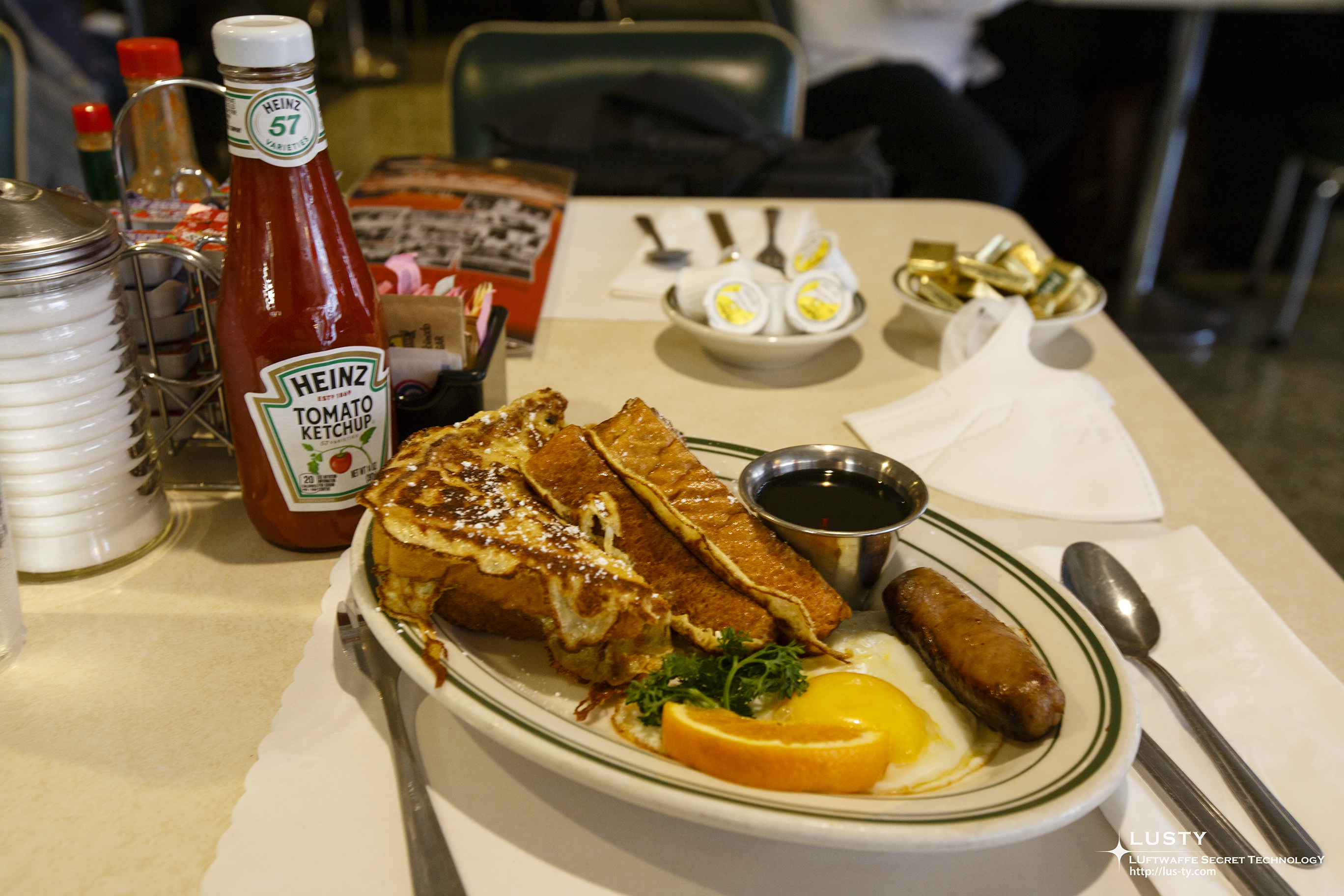 아침은 Mel's Drive in에서. 여기도 어제 갔던 Sear's Fine food처럼 하루종일 영업하는 곳인데, 아침에는 아침 메뉴들을 판다. 오늘 주문한 건 프렌치 토스트. 프렌치토스트와 선택 가능한 계란, 소시지 하나를 주는 메뉴였다. 계란은 서니사이드업으로 주문했는데 괜찮은 조합이었던 것 같다. 다만 이게 $14라는걸 생각하면 조금 아쉽다는 느낌은 있다.