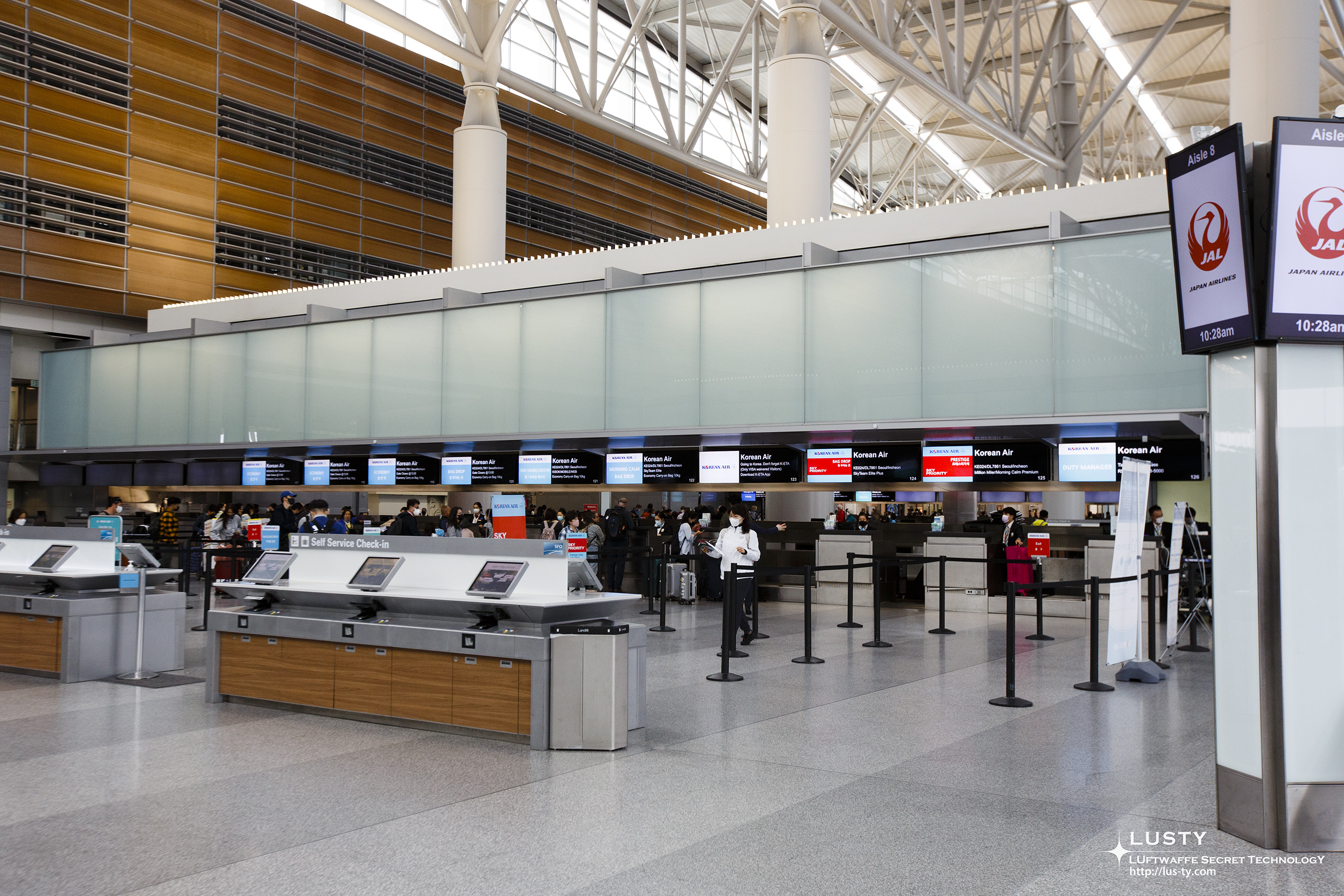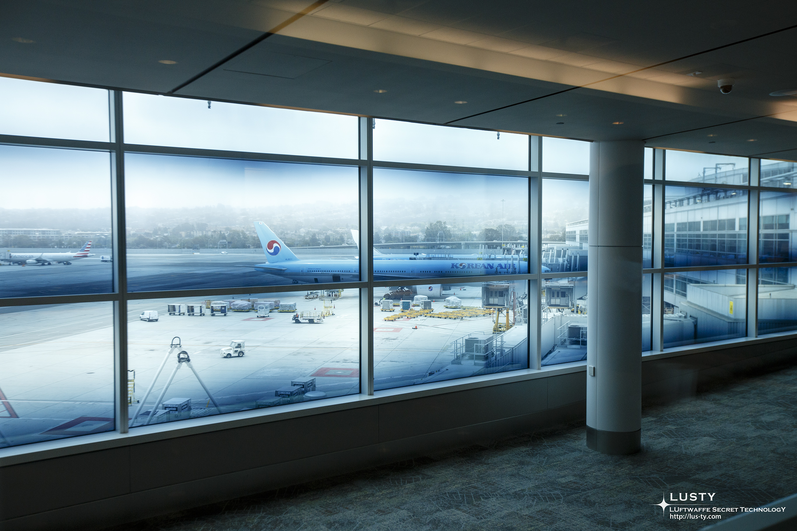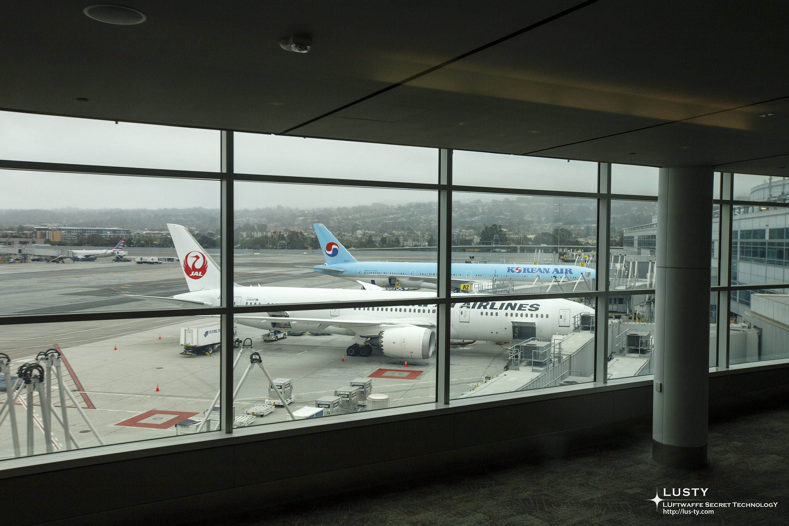 라운지에서 보이는 주기장. JAL의 B787-9와 KAL기가 나란히 주기되어 있다. 이쪽 터미널 A는 스카이팀과 원월드가 주력이라 이런 모습도 가능한 듯 하다.