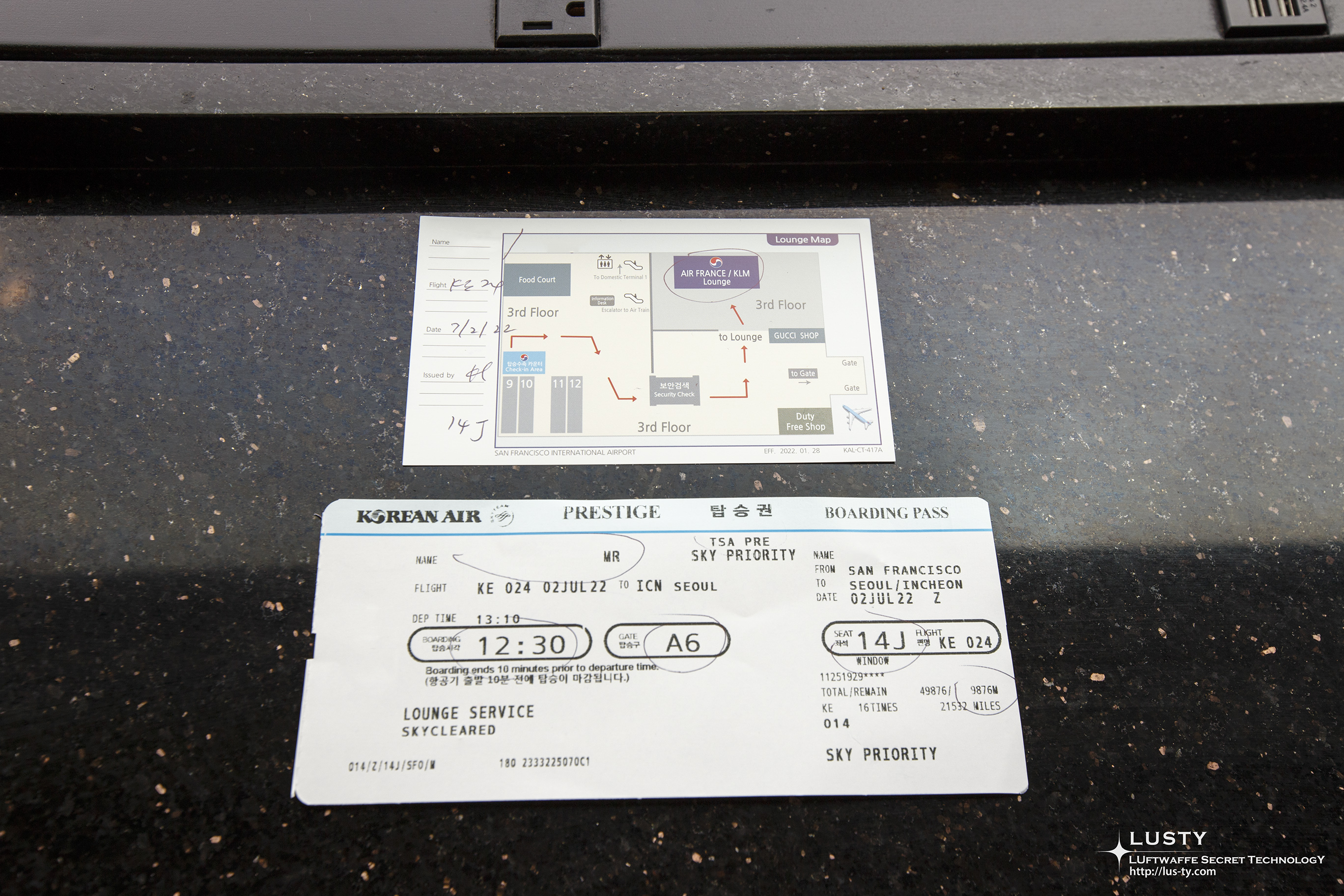 오늘의 티켓. 프레스티지와 TSA PreCheck이 찍혀 있다. TSA PreCheck을 사용하기 위해서는 미리 항공사에 TSA 넘버를 등록해두어야 하고, 그게 표에 찍혀 있으면 TSA라인에 설 수 있다. 비즈니스 승객은 라운지 위치가 안내되어 있는 종이도 나누어 준다.