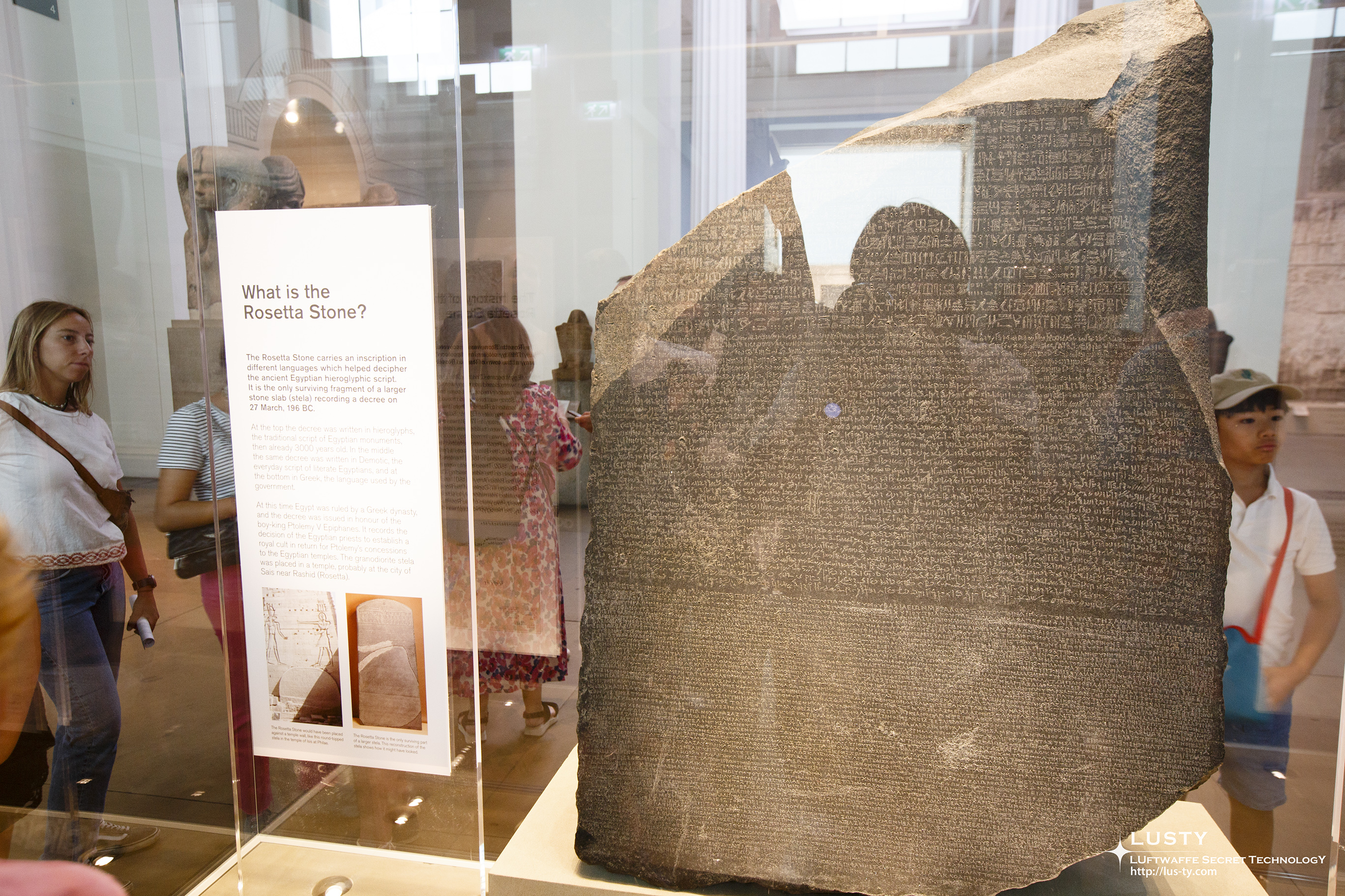 대영 박물관의 전시품 중 가장 유명할 법한 로제타 스톤. 같은 내용의 내용이 상형문자와 간소화된 상형문자인 민중문자, 그리스 문자의 3가지 종류로 적혀있어서 상형문자를 해석할 수 있게 되었다는 돌이다. 프랑스군이 발견했지만 1802년 나폴레옹이 패퇴하면서 이집트에 고립된 프랑스군을 무사히 귀환시켜주는 조건으로 영국군이 받아가서 지금까지도 대영박물관에 전시되어 있다.