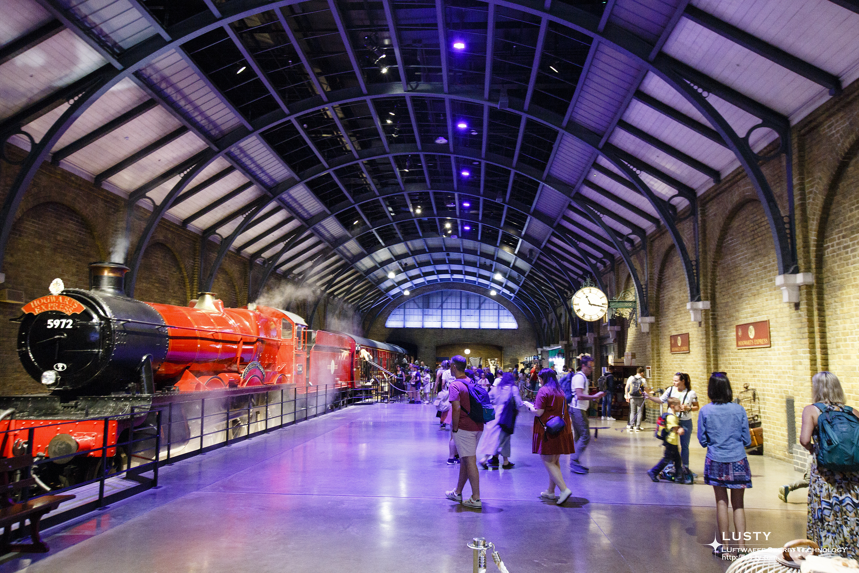 이어지는 것은 킹스 크로스 역의 9와 ¾승강장. 들어가면 기적소리를 내뿜는 새빨간 호그와트 급행 열차가 서 있다.