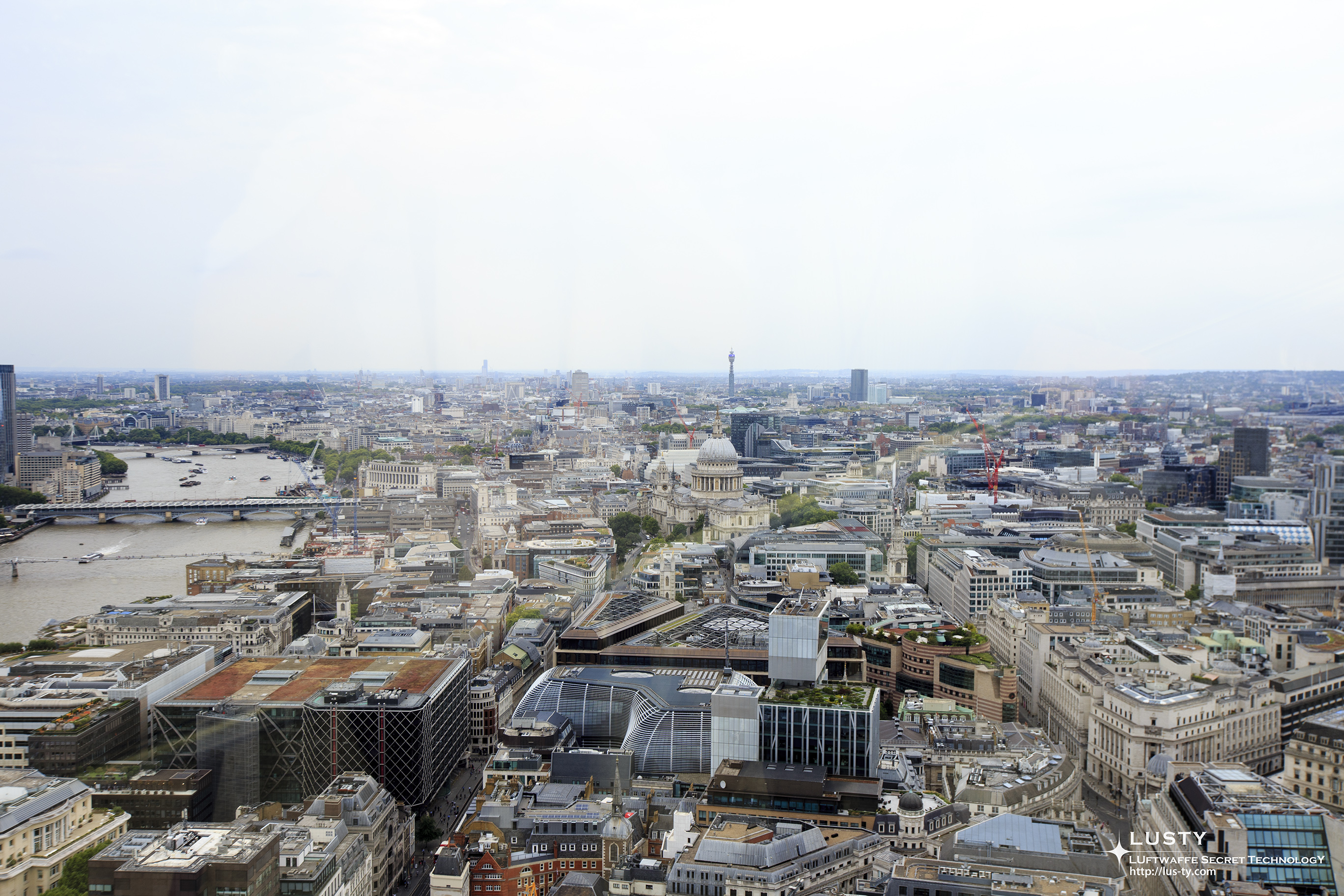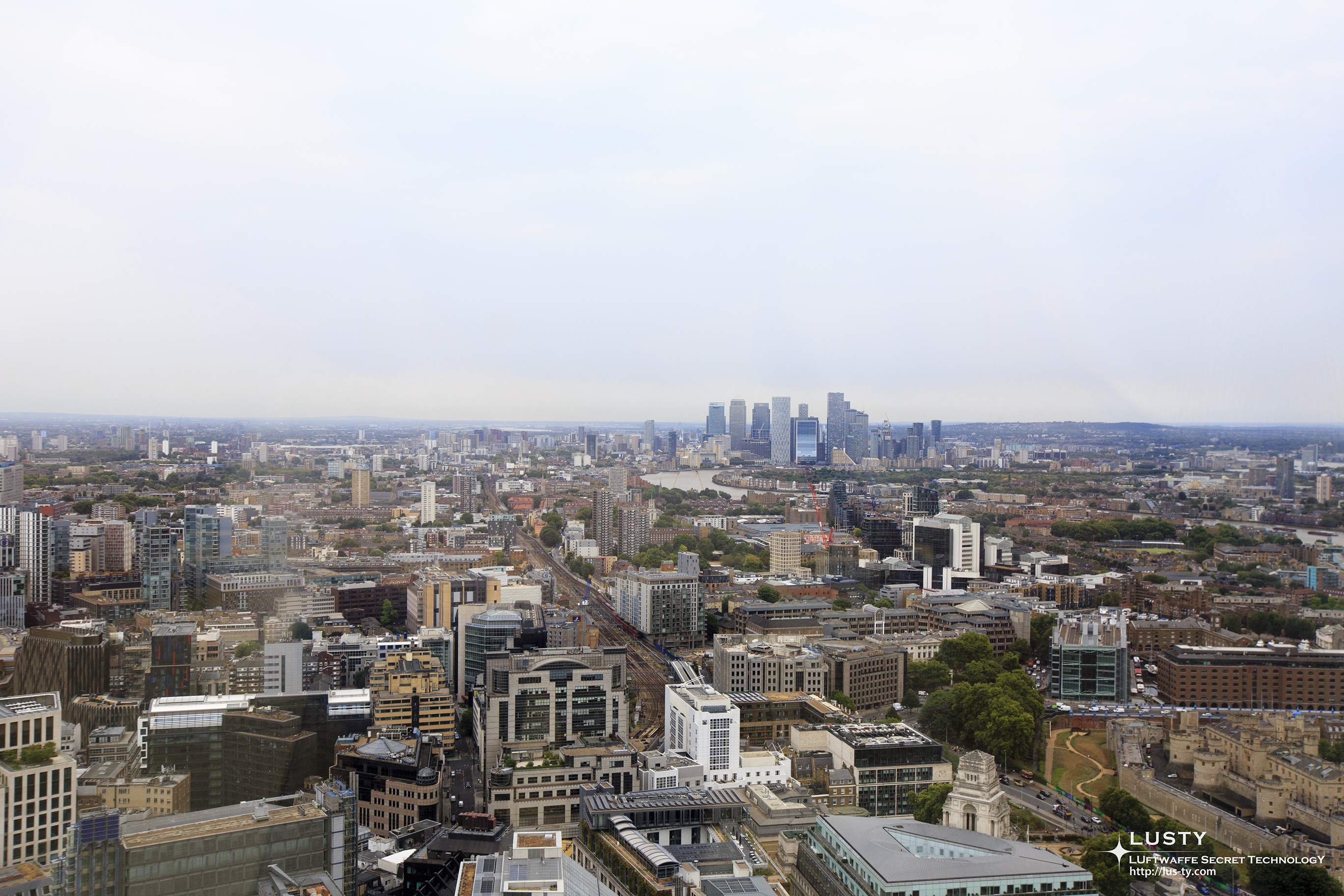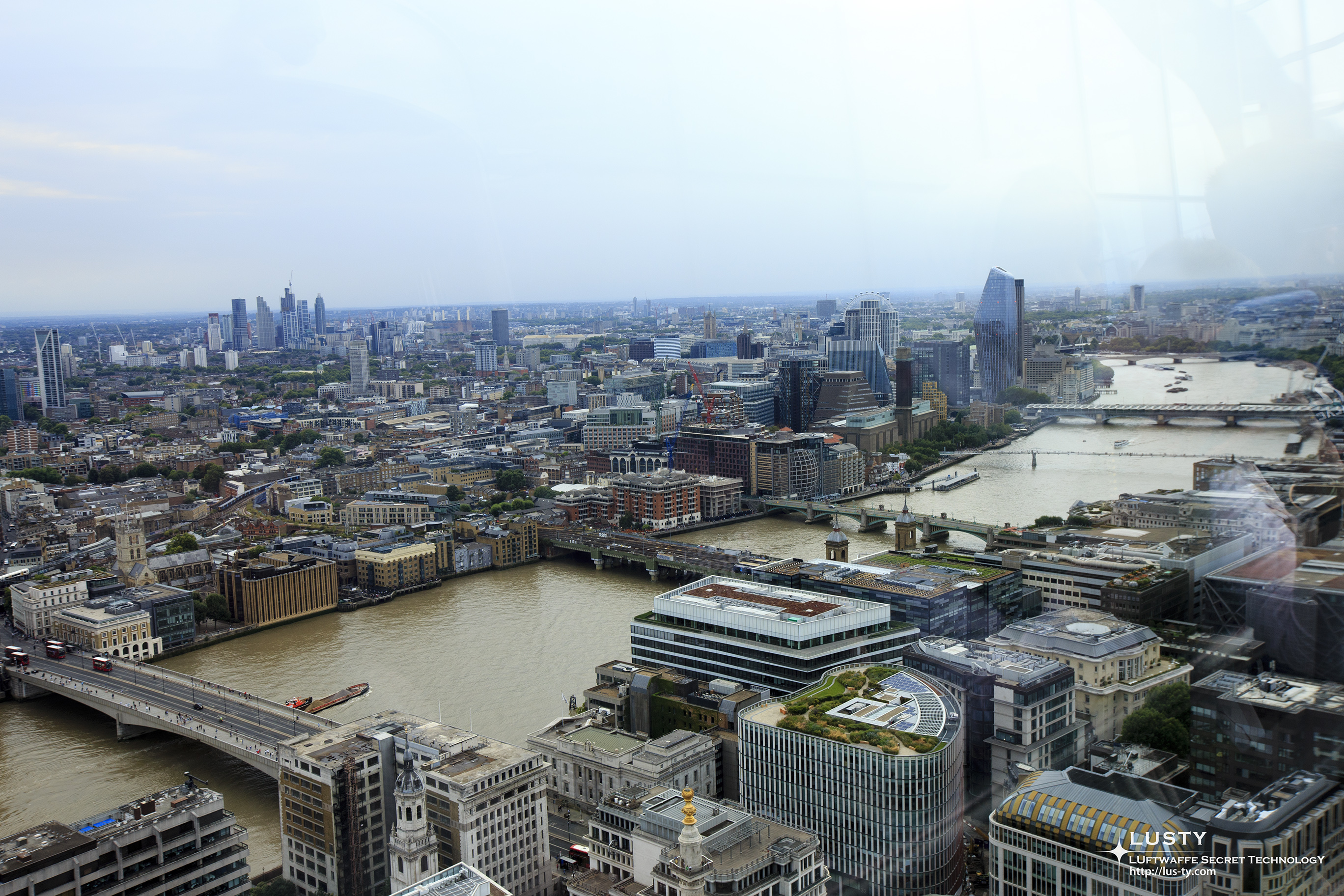 시선을 멀리 옮기면 오른쪽 아래의 타워 오브 런던부터 시작해 런던의 교외 모습이 보이고, 더 멀리에는 카나리 워프의 고층건물군이 눈에 들어온다. 사실 런던에 존재하는 고층건물군은 이 건물이 존재하는 시티 오브 런던과 카나리 워프 두 곳에 집중되어 있고, 다른 대부분의 장소에서는 10층 이상의 건물을 보기가 어려운 편이다. 같은 섬나라의 수도라서 그런지, 이 점도 고층건물군이 몇 군데에 집중된 도쿄와 비슷하다는 느낌을 받았다.