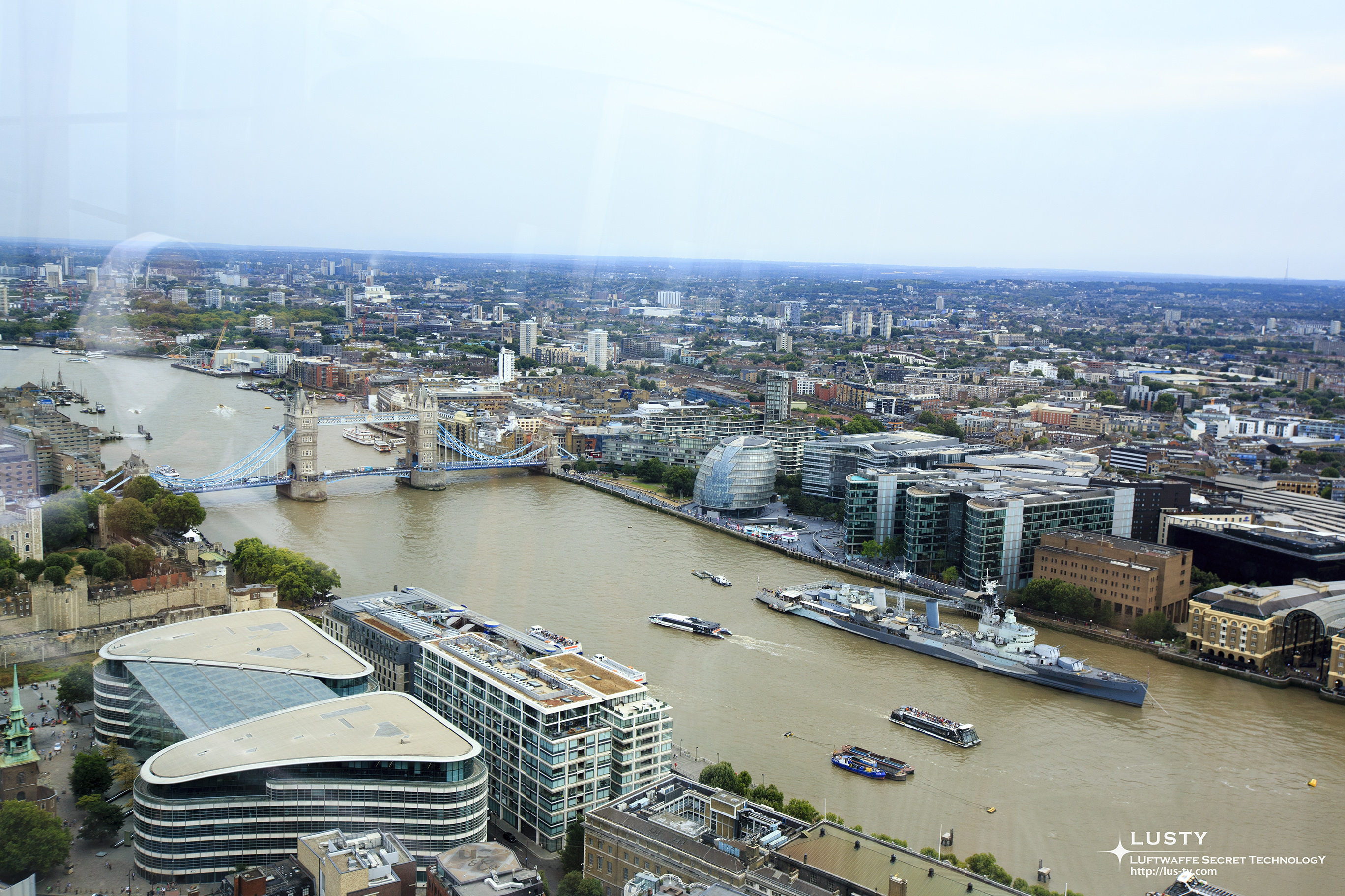 왼쪽을 바라보면 역시 가장 눈에 띄는 것은 템즈 강 한가운데 정박한 HMS 벨페스트와 타워 브릿지, 그리고 그 사이에 있는 구형 건물인 런던 시청이다. 타워브릿지와 HMS 벨페스트는 어젯 밤에도 보았지만, 런던 시청을 제대로 보는 것은 오늘이 처음인 것 같기도 하다. 런던 시청은 그 형상 때문에 유명하기도 한데, 유리로 마감되어 있어서 더울 것 같지만 악랄한 더위로 유명한 서울의 시청과는 다르게 실제로는 개폐가 가능한 창문이고, 창문 위에는 모두 차광막이 있어서 에너지 효율이 좋다고 한다.