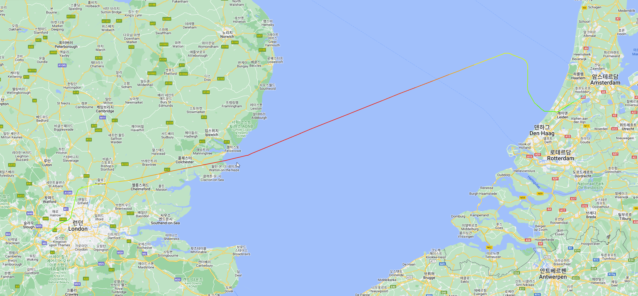 비행 경로. 런던에서 암스테르담까지 정말 가깝다는 걸 다시한 번 느낄 수 있었다.