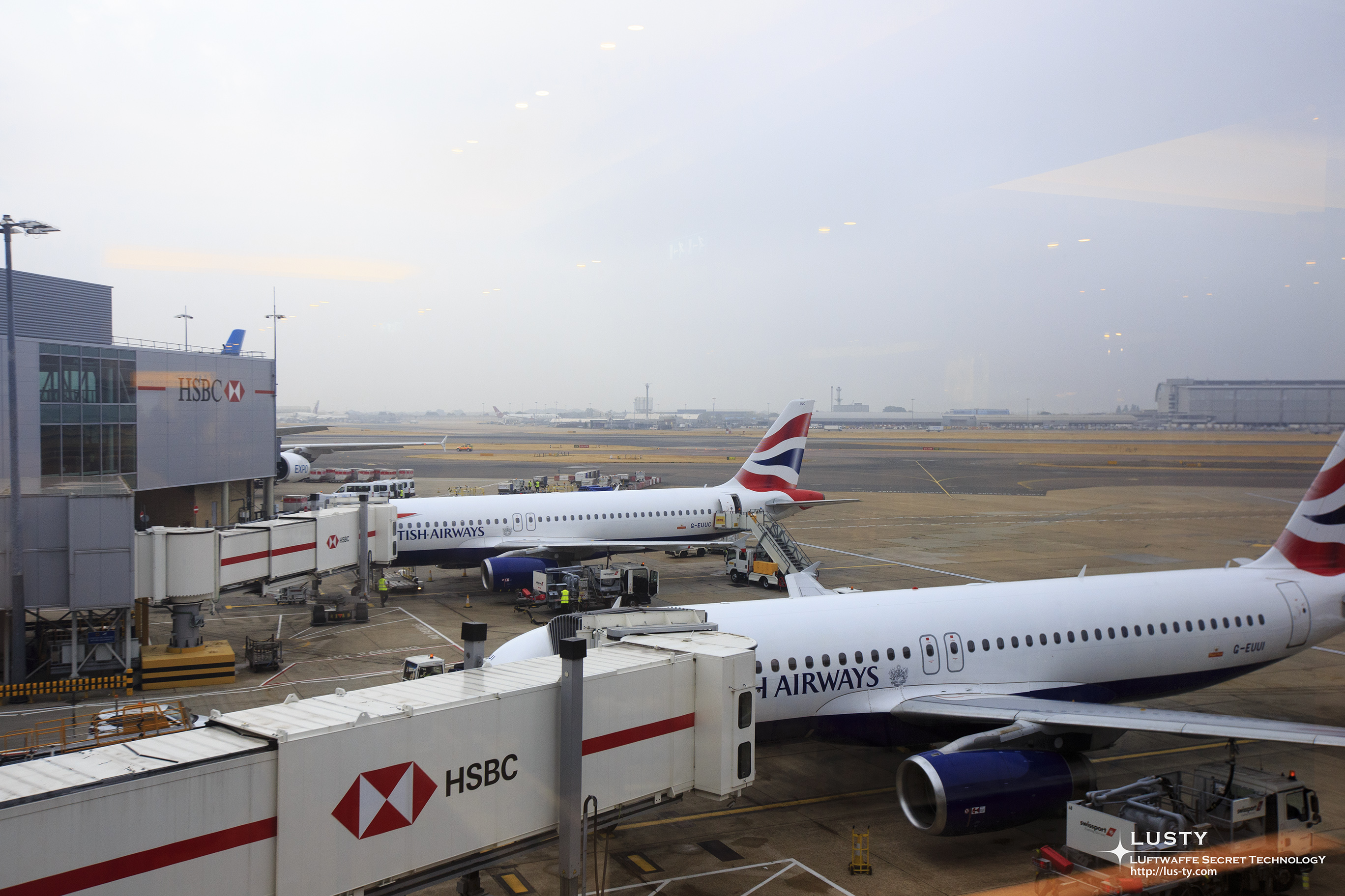 라운지에서 보이는 공항 뷰. 영국항공이 늘어서 있다.