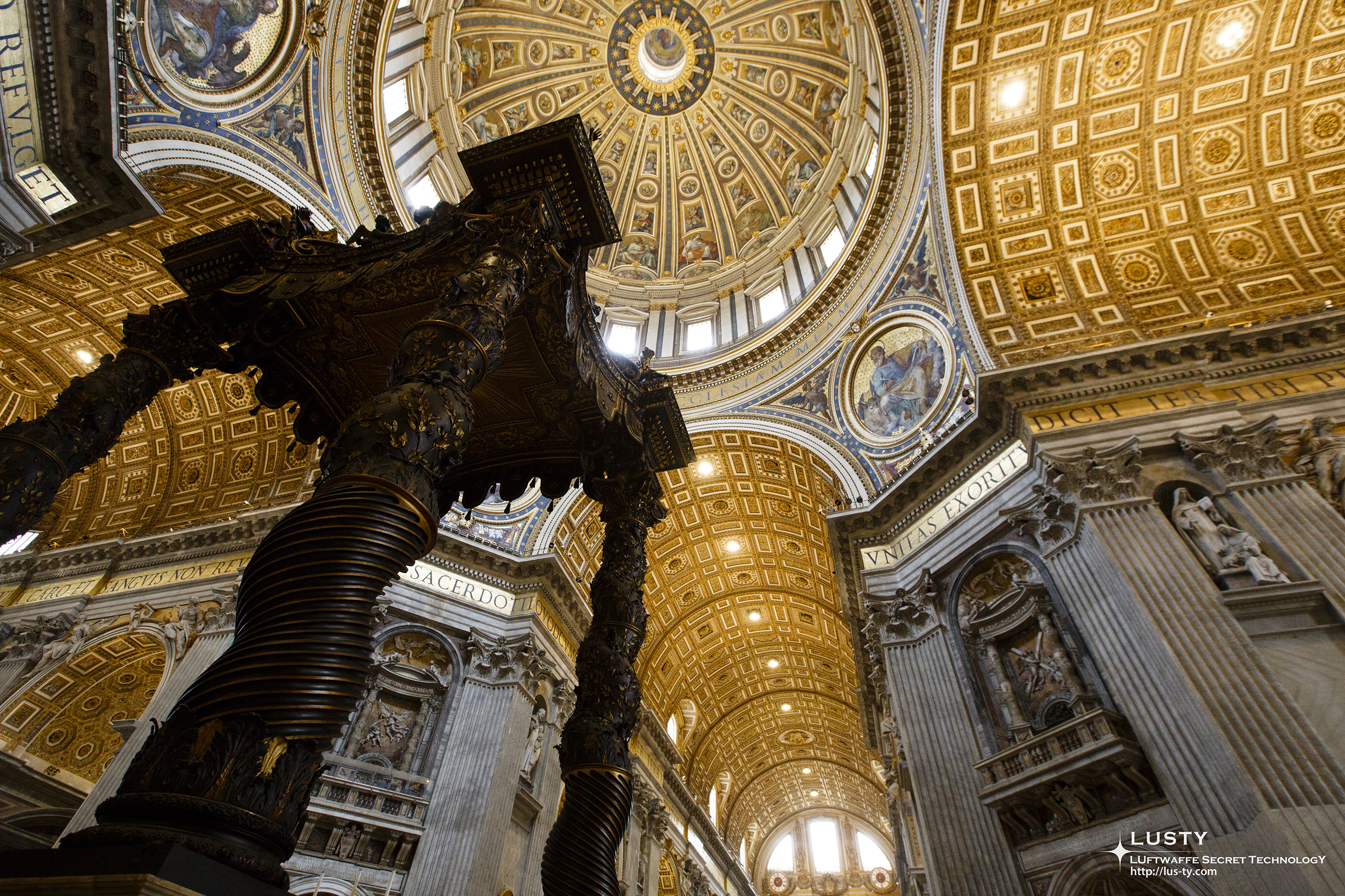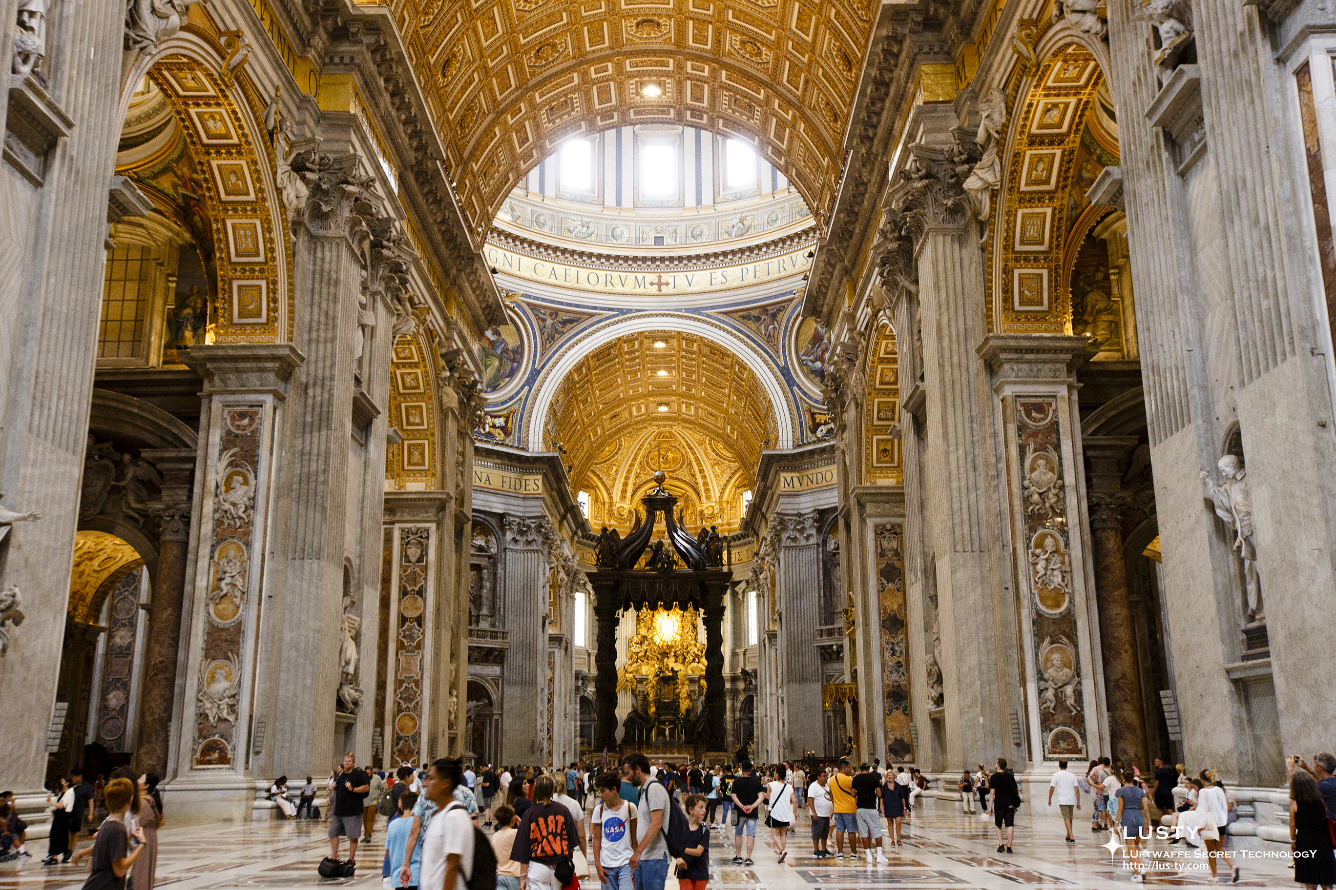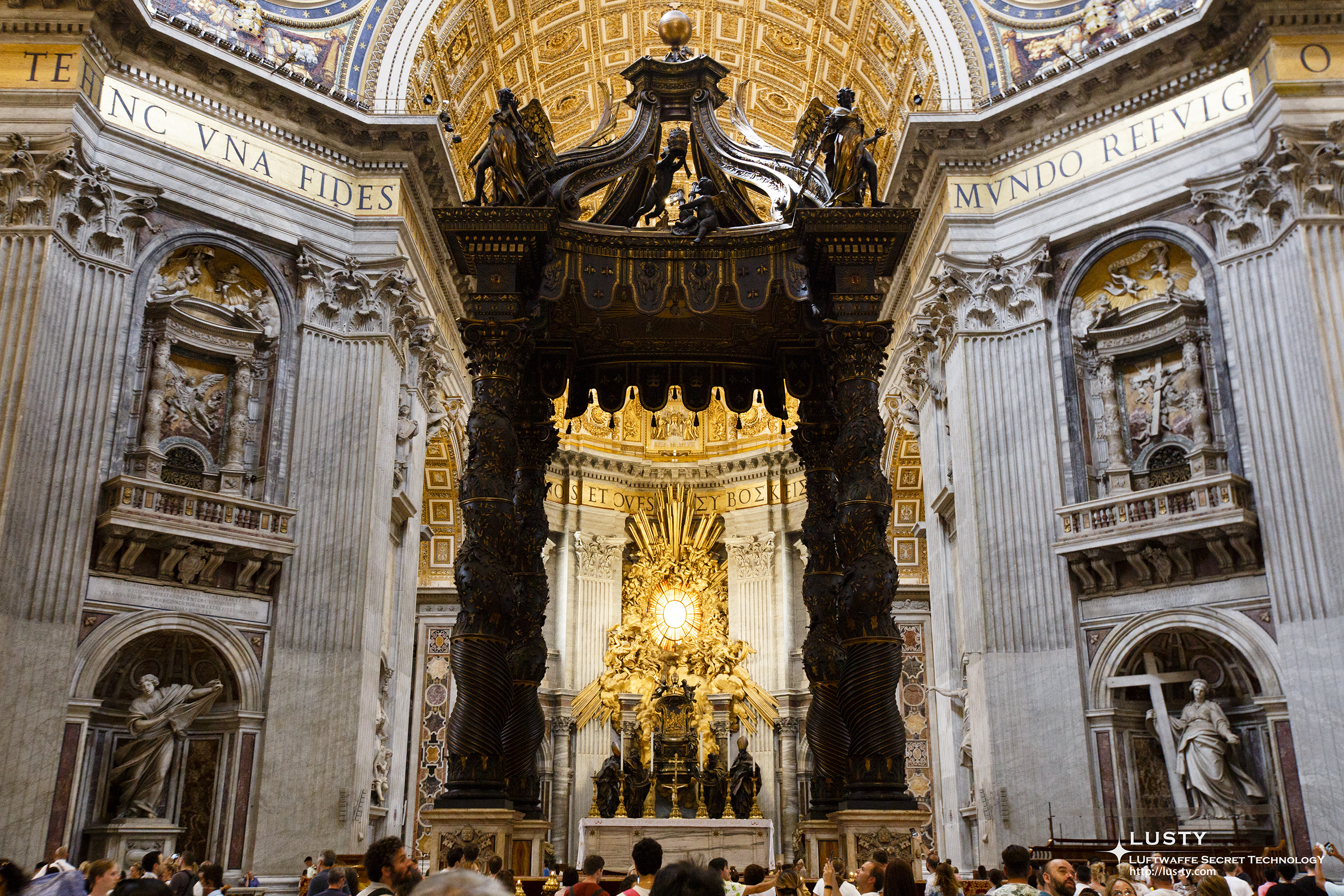대성당을 들어가면 바로 이런 뷰가 펼쳐진다. 중앙에는 지안 로렌초 베르니니(Gian Lorenzo Bernini) 가 디자인한 발다친(baldachin)이 서 있는데, 청동과 금박을 입혀 밝은 대성당의 분위기와 대비를 이루어 시선을 가게 만든다. 이 발다친은 성 베드로의 무덤이 있는 장소를 표시하기 위해 만들어졌다고 하며, 대성당 내부에서 시각적 초점 역할 또한 하고 있다고 한다.