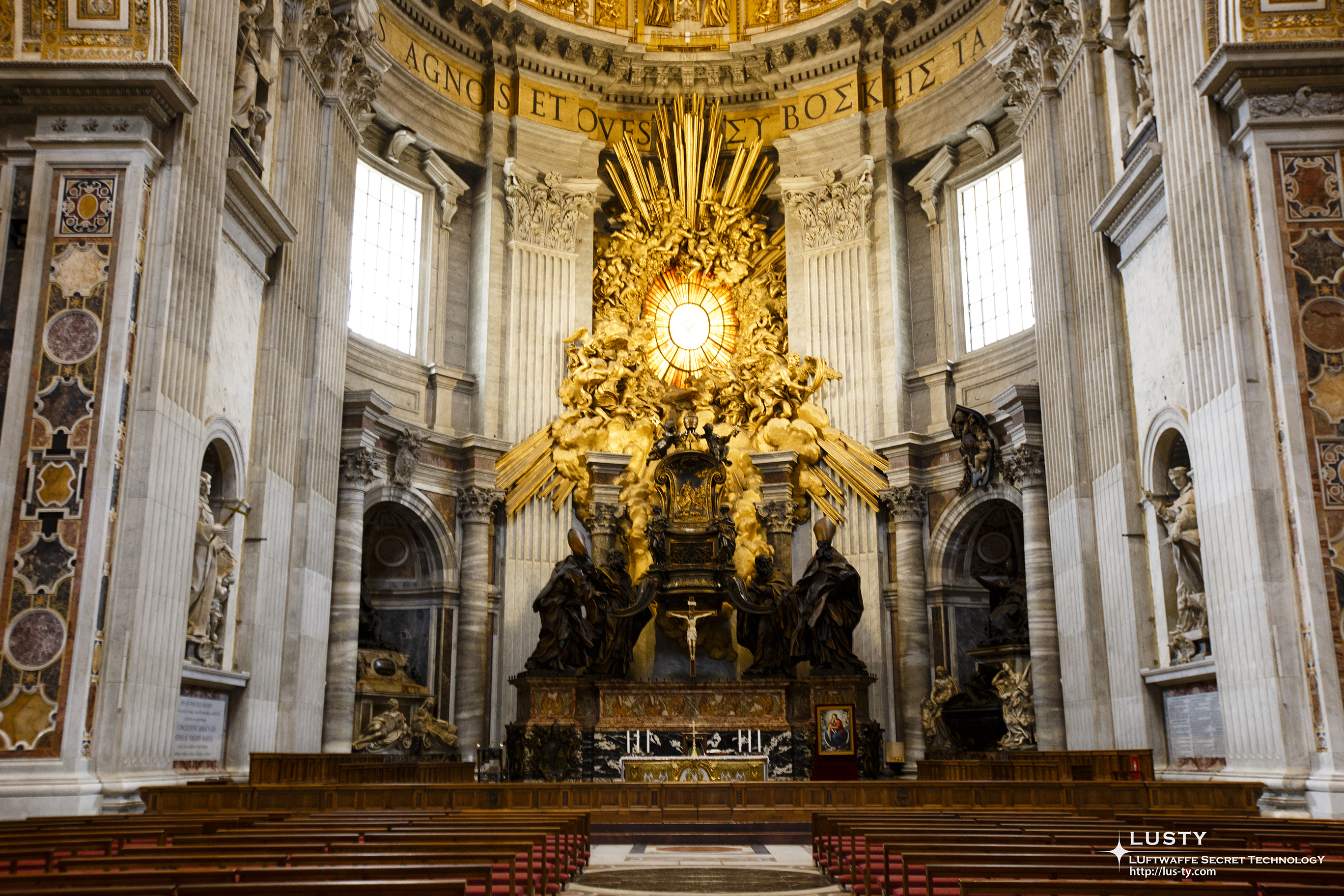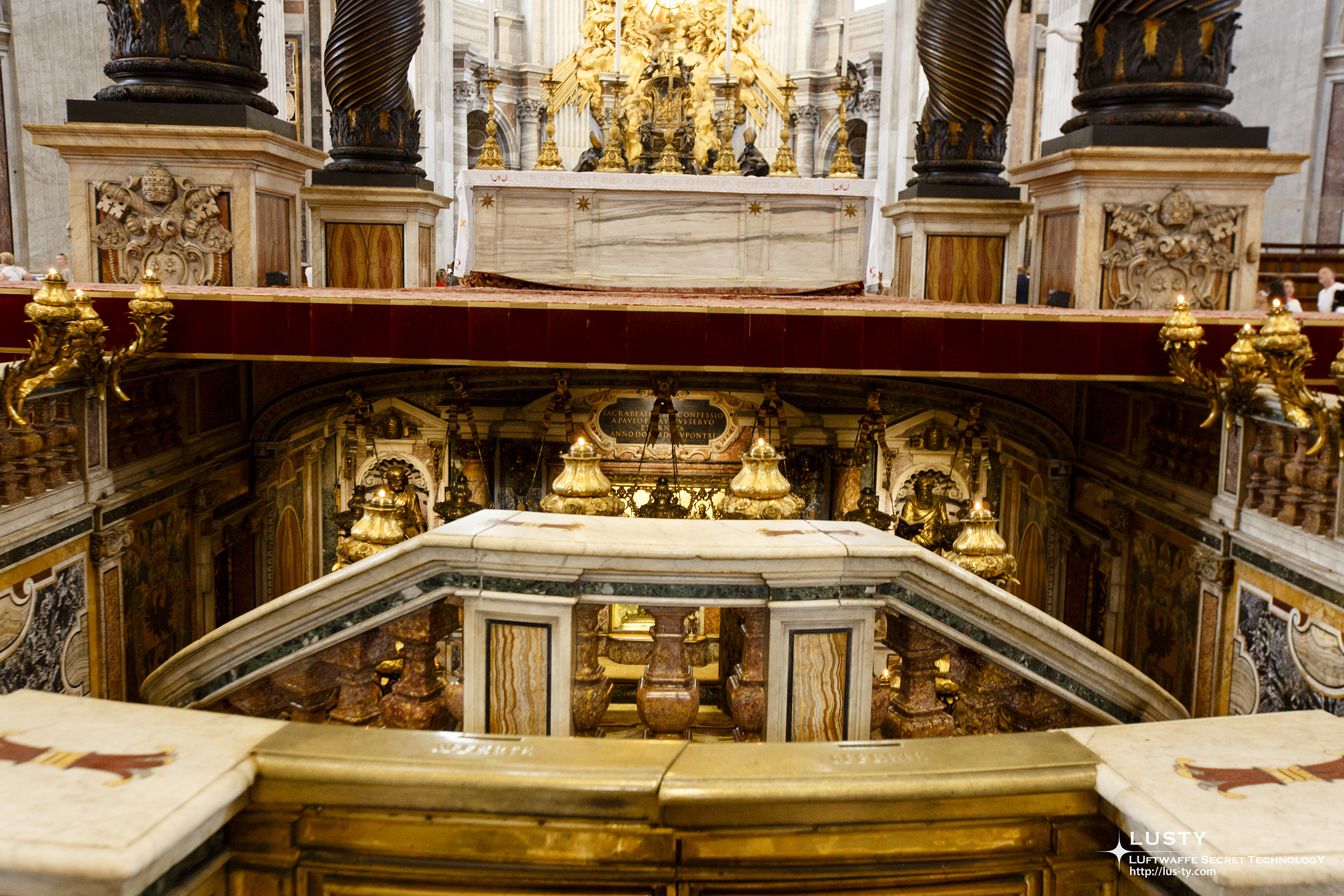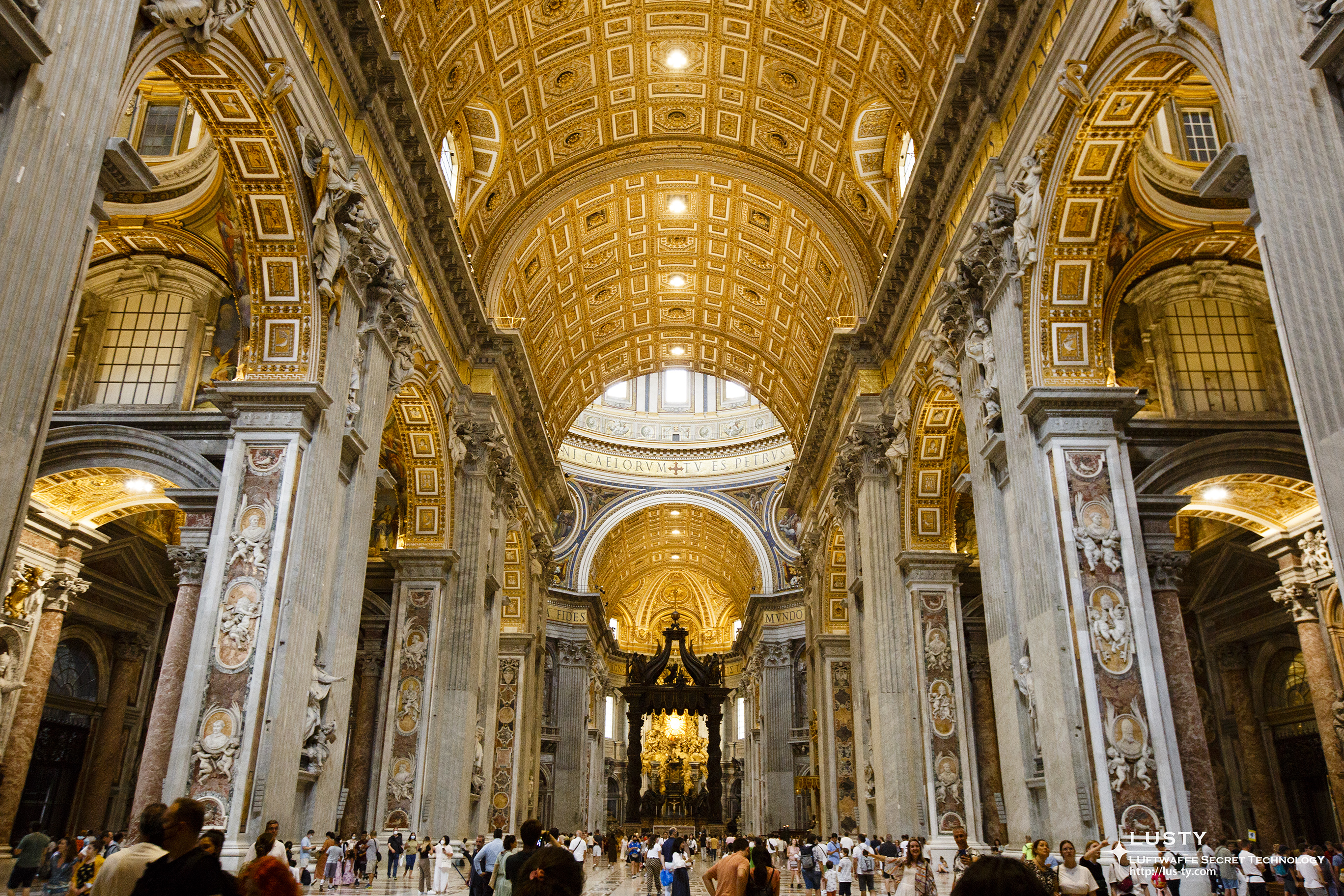 대성당을 들어가면 바로 이런 뷰가 펼쳐진다. 중앙에는 지안 로렌초 베르니니(Gian Lorenzo Bernini) 가 디자인한 발다친(baldachin)이 서 있는데, 청동과 금박을 입혀 밝은 대성당의 분위기와 대비를 이루어 시선을 가게 만든다. 이 발다친은 성 베드로의 무덤이 있는 장소를 표시하기 위해 만들어졌다고 하며, 대성당 내부에서 시각적 초점 역할 또한 하고 있다고 한다.