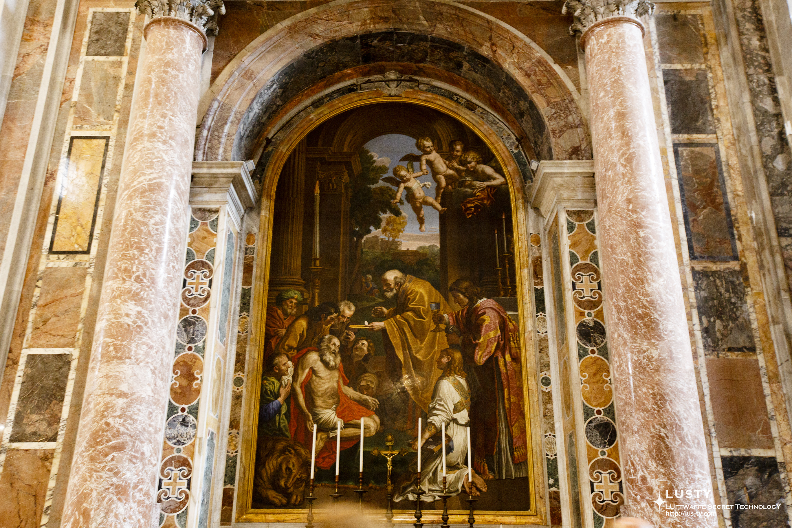 이 그림은 원래 도메니치노(Domenico Zampieri)가 1614년에 그린 '성 제롬의 최후의 영성체'로, 초기 기독교 학자이자 라틴어로 성경을 번역한 성 제롬 죽기 전에 마지막 영성체를 받는 것을 묘사하는 그림인데, 1730년 베드로 대성당을 장식하기 위한 모자이크로 변형되었다고 한다. 위의 베드로를 묘사한 그림과 마찬가지로 대성당에 있는 대부분의 그림들은 다양한 색들의 돌로 만들어낸 모자이크라고 한다.