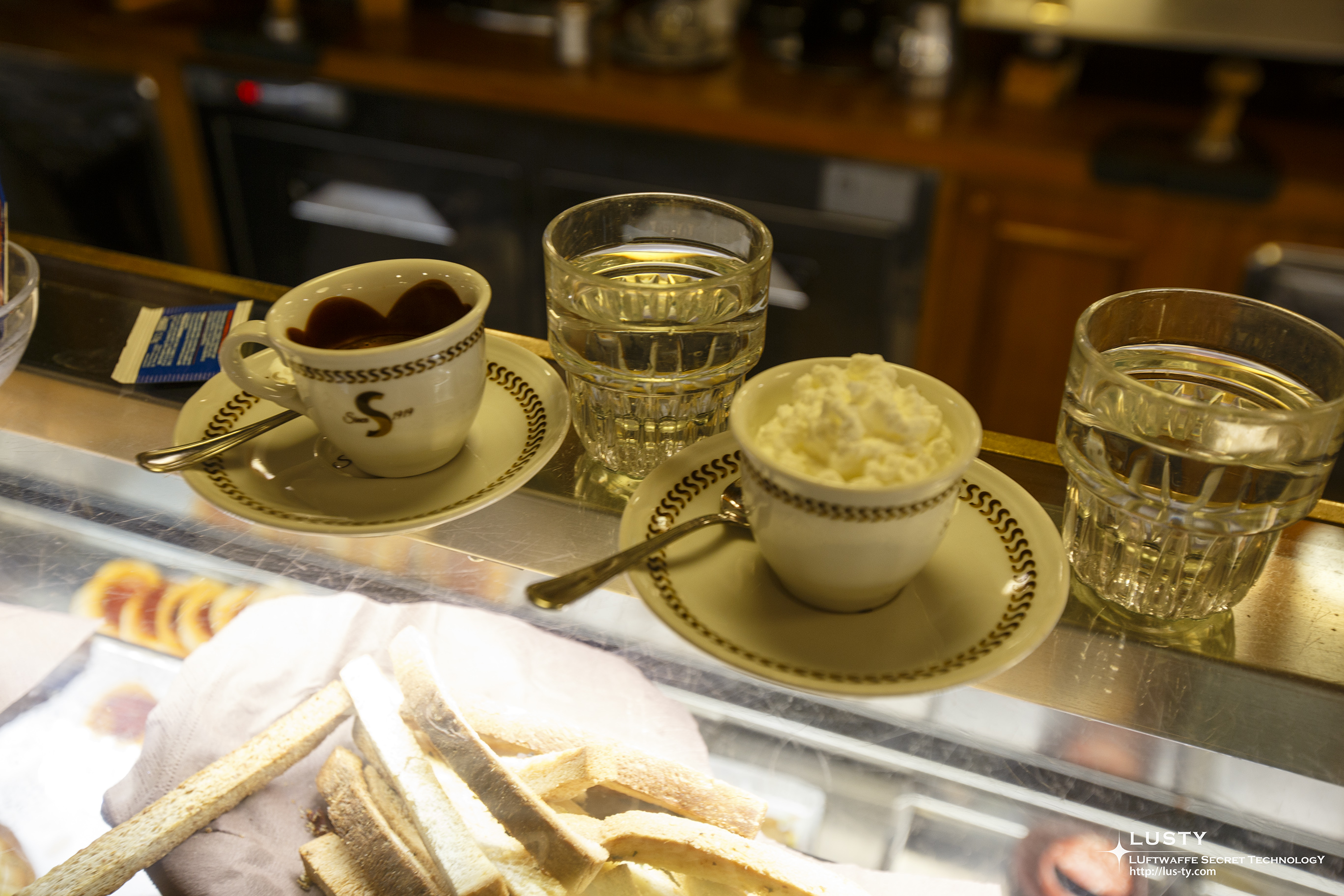 오른쪽은 역시 이탈리아에서 먹어보고 싶었던 에스프레소 콘파냐. 쌉쌀한 에스프레소와 단 크림의 조합이 좋았다.