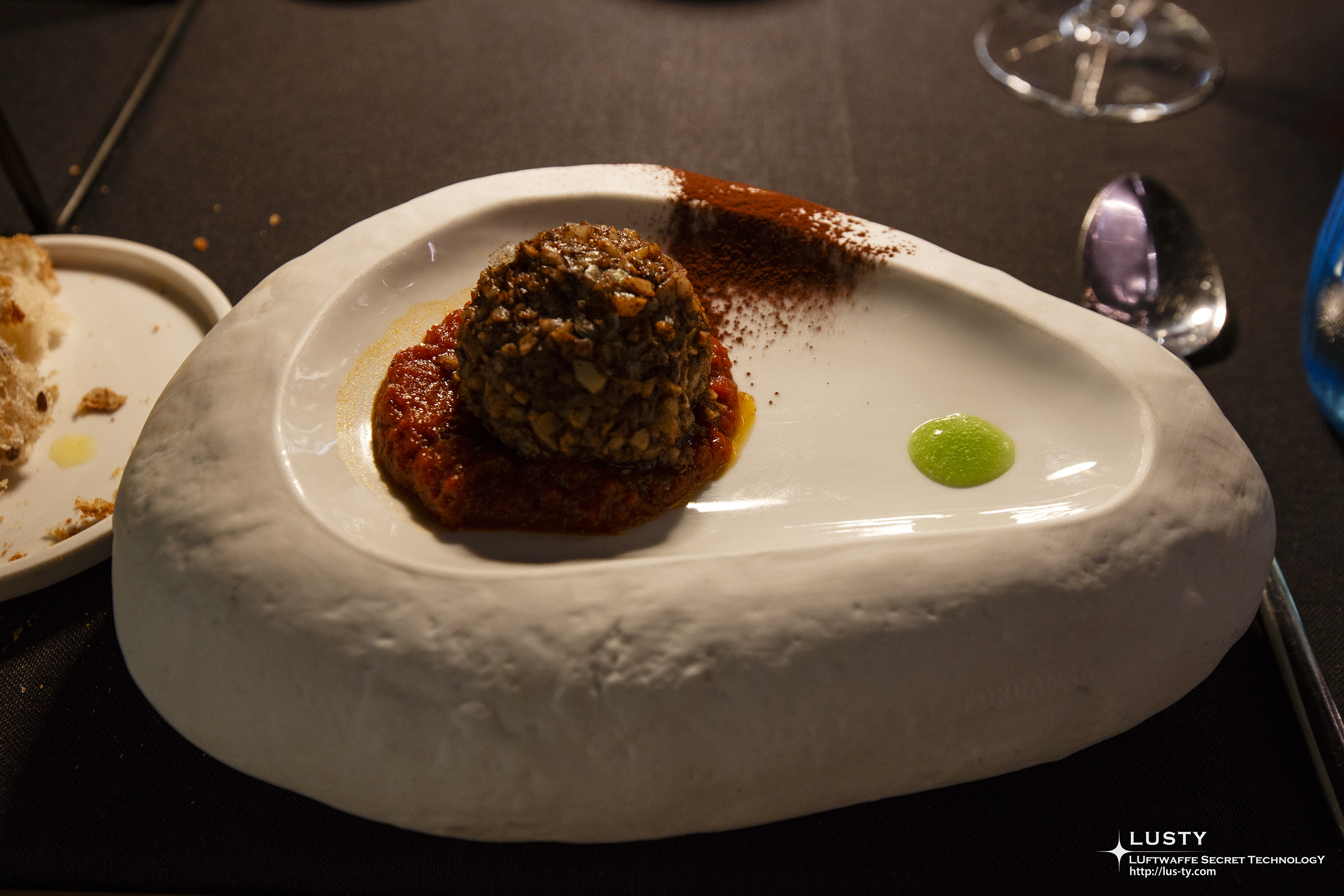 페레로 로쉐처럼 만든 메인메뉴. 겉면을 버섯과 견과류로 감싸 바삭하게 만들고, 안에는 다진 소고기를 넣었다.