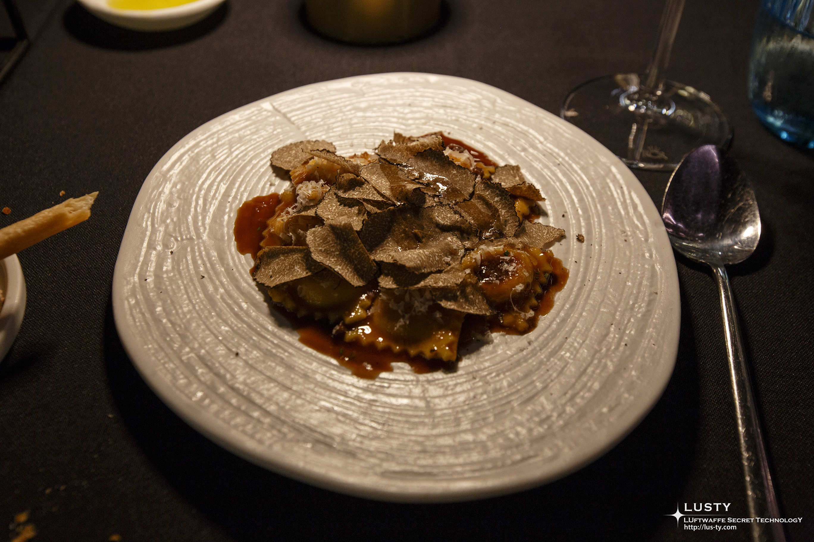 라비올리가 보이지 않을 정도로 한가득 올려진 트러플이 입안에서 폭발하면서 굉장히 호사스러운 경험을 제공한다.