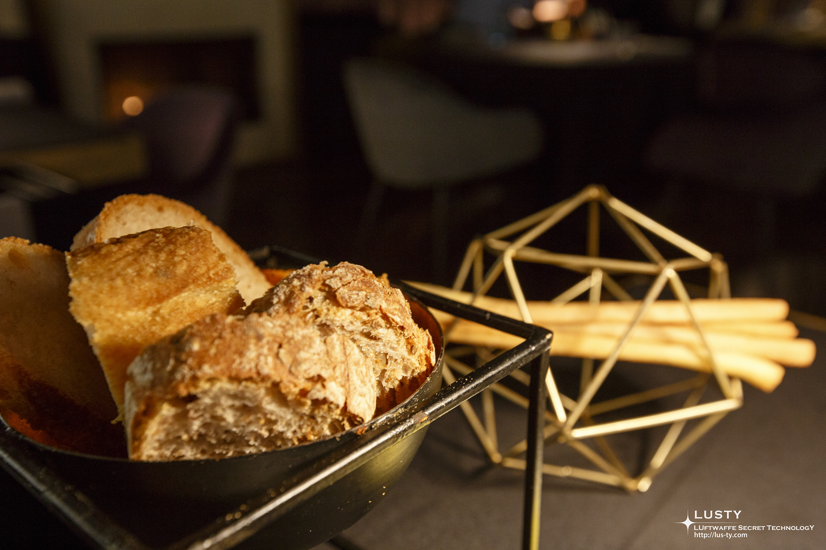 그리고 빠질 수 없는 식전빵. 정이십면체 프레임에 쌓은 그리시니와 정육면체 프레임에 얹어진 바게트.