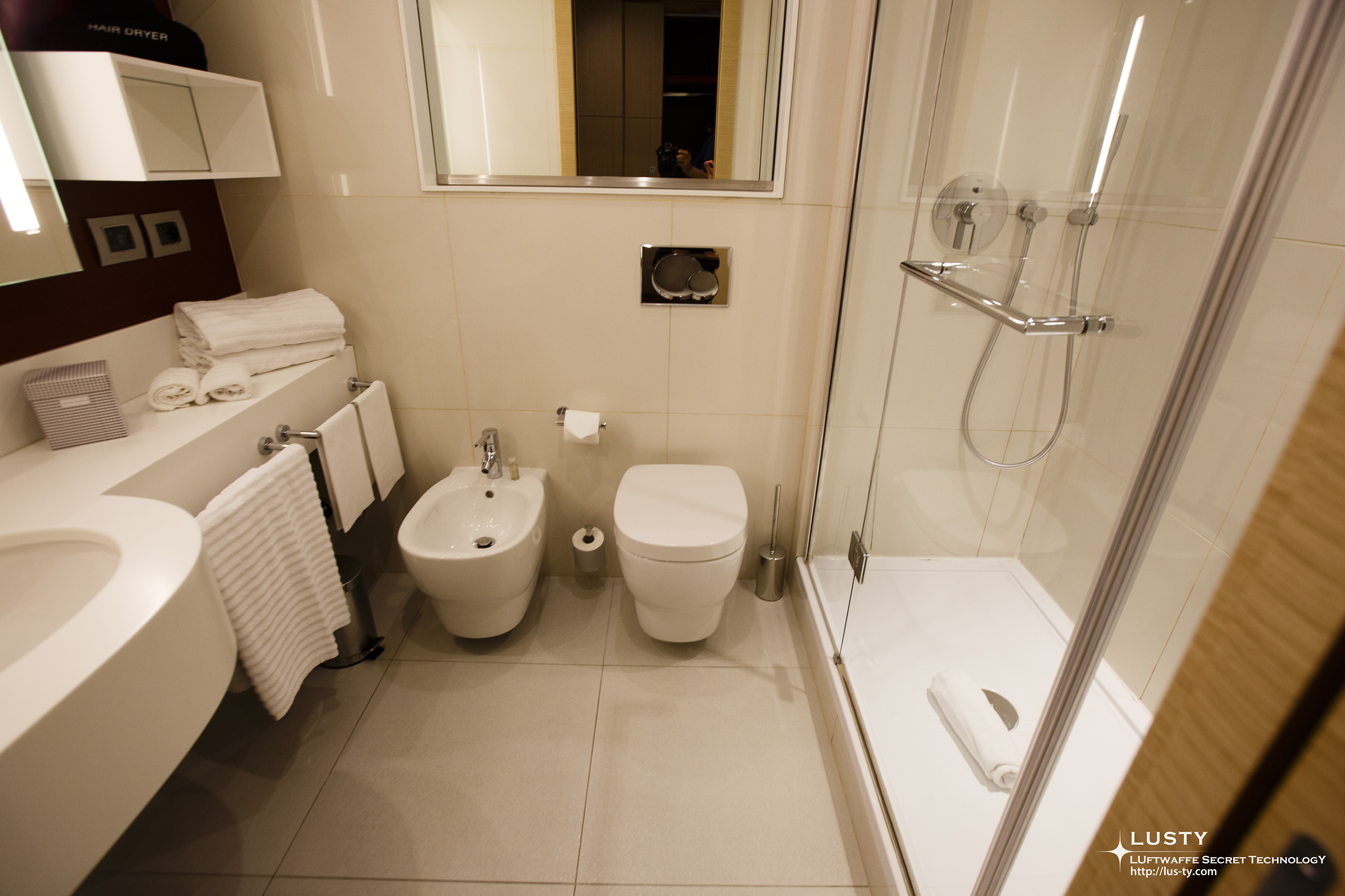 화장실. 왼쪽에 있는 건 비데인데, 전동식 워시렛이 아닌 수동으로 닦는 비데는 처음 본 것 같다.