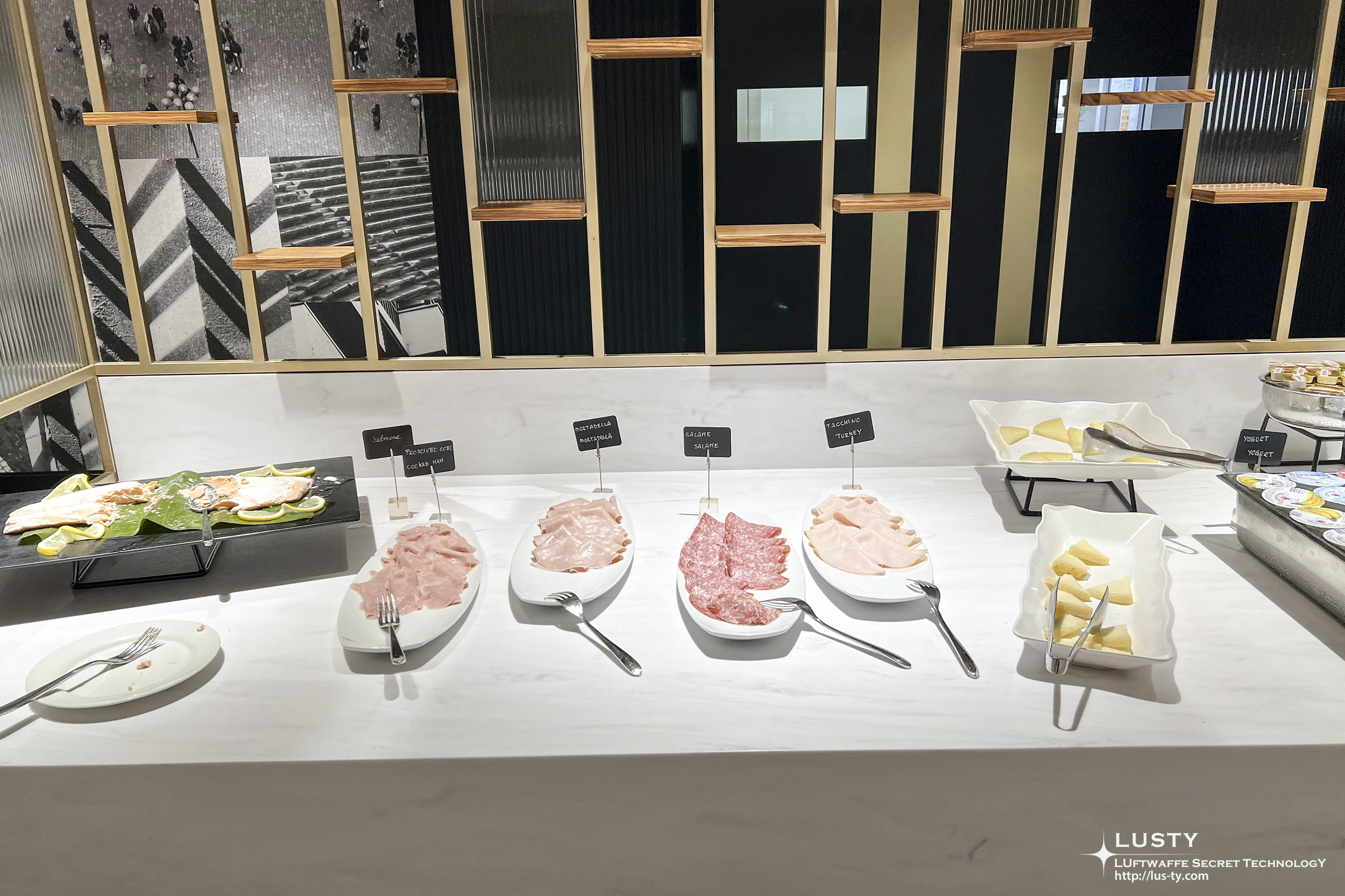 본격적으로 조식. 다양한 종류의 햄과 치즈, 연어가 기본으로 준비되어 있다.