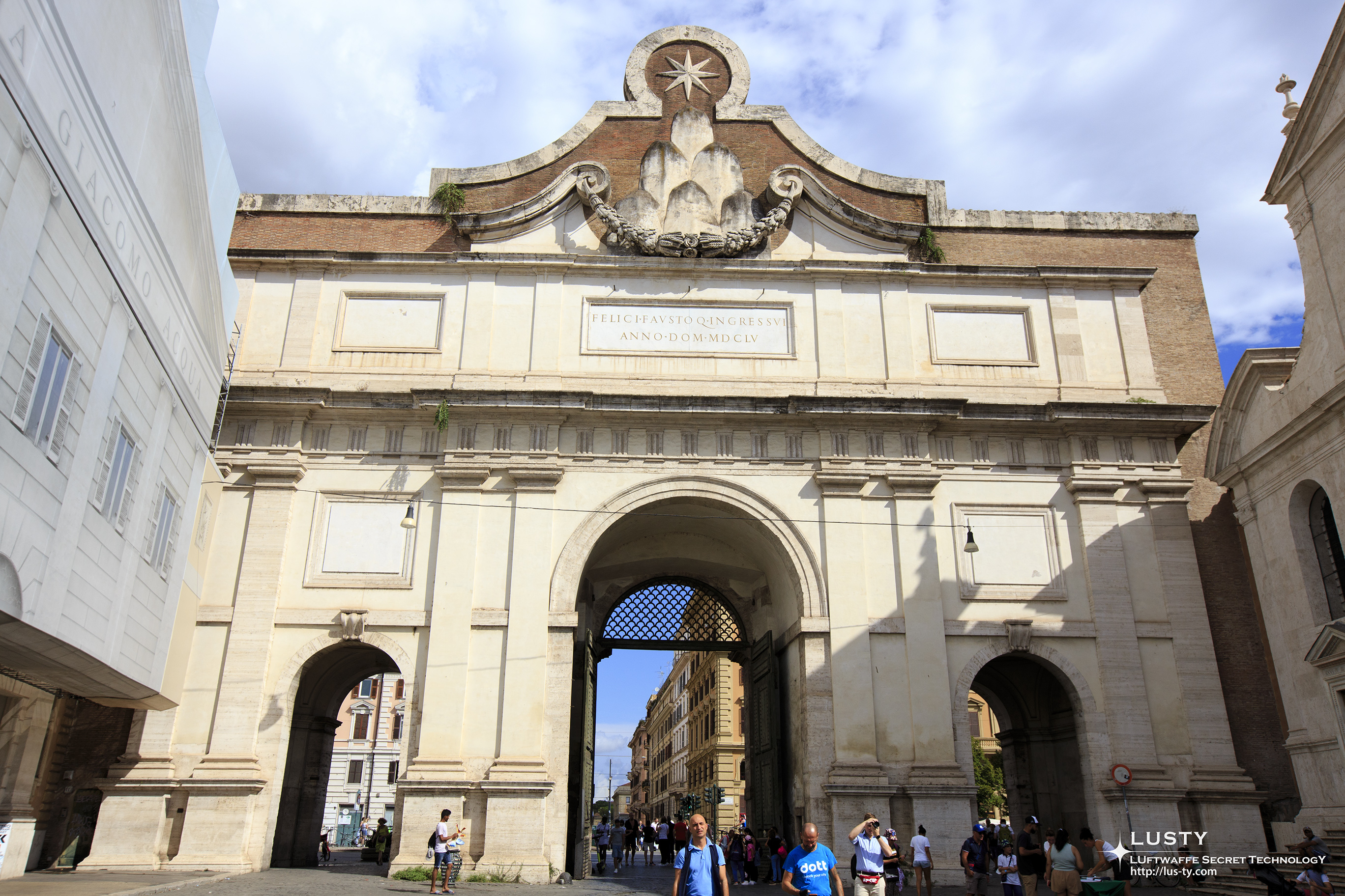 아우렐리아누스 성벽에 있는 도시 성문인 포르타 델 포폴로인데, 이 문을 지나면 포폴로 광장으로 이어진다.