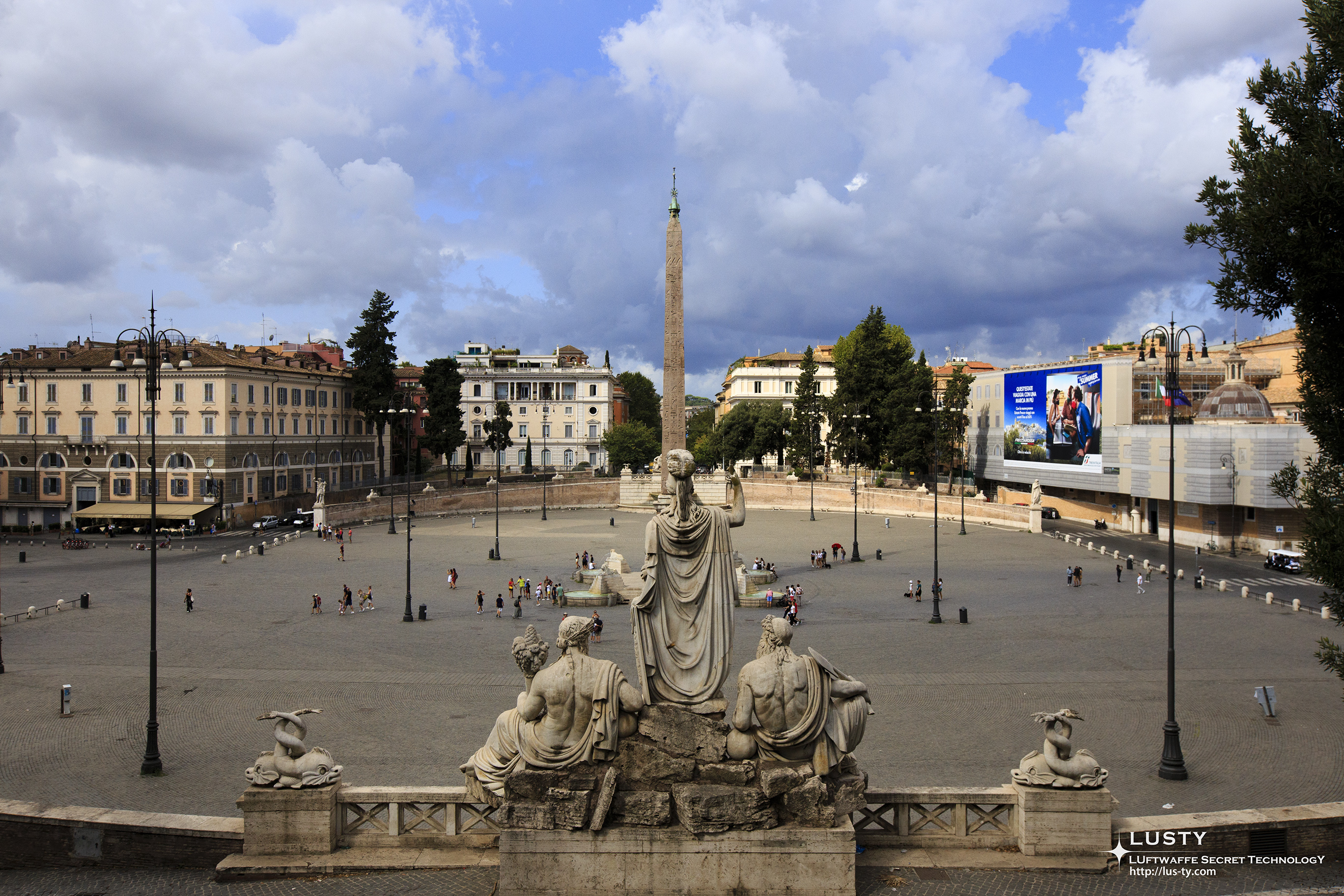 뒤에 있는 돔 형태의 건물들은 쌍둥이 성당이라고도 불리우는 성당이지만 서로 다른 성당으로, 왼쪽이 산타 마리아 인 몬테산토(몬테산토의 성모 마리아) 성당과 산타 마리아 데이 미라콜리(기적의 성모 마리아) 성당이다. 두 성당은 비슷해 보이지만 산타 마리아 인 몬테산토의 돔은 타원형이고, 오른쪽 산타 마리아 데이 미라콜리의 돔은 원형이라고 한다. 분명히 다르지만 오벨리스크와 함께 보았을 때 굉장히 균형잡힌 모습을 보여주는 점이 놀라웠다.