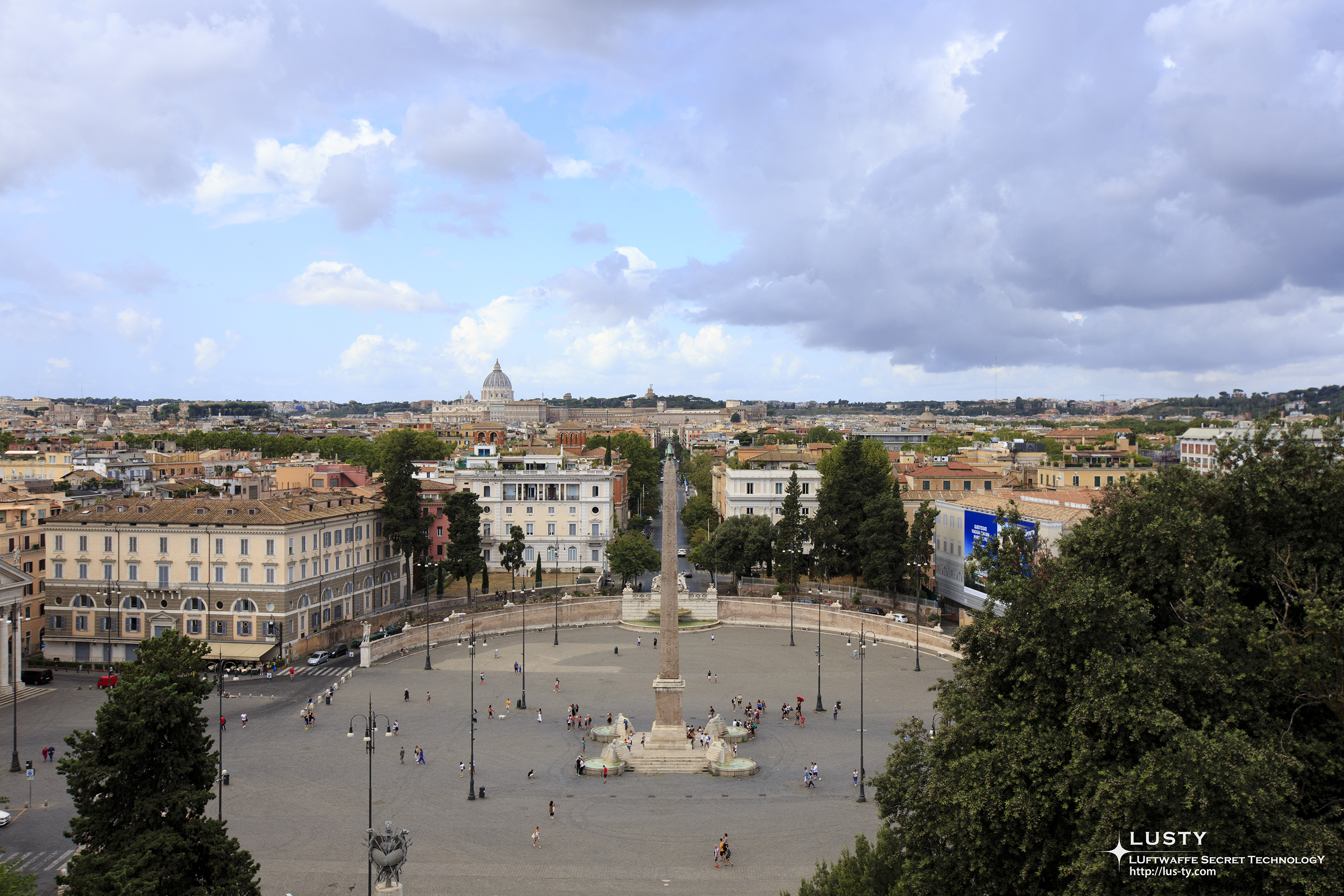뒤에 있는 돔 형태의 건물들은 쌍둥이 성당이라고도 불리우는 성당이지만 서로 다른 성당으로, 왼쪽이 산타 마리아 인 몬테산토(몬테산토의 성모 마리아) 성당과 산타 마리아 데이 미라콜리(기적의 성모 마리아) 성당이다. 두 성당은 비슷해 보이지만 산타 마리아 인 몬테산토의 돔은 타원형이고, 오른쪽 산타 마리아 데이 미라콜리의 돔은 원형이라고 한다. 분명히 다르지만 오벨리스크와 함께 보았을 때 굉장히 균형잡힌 모습을 보여주는 점이 놀라웠다.