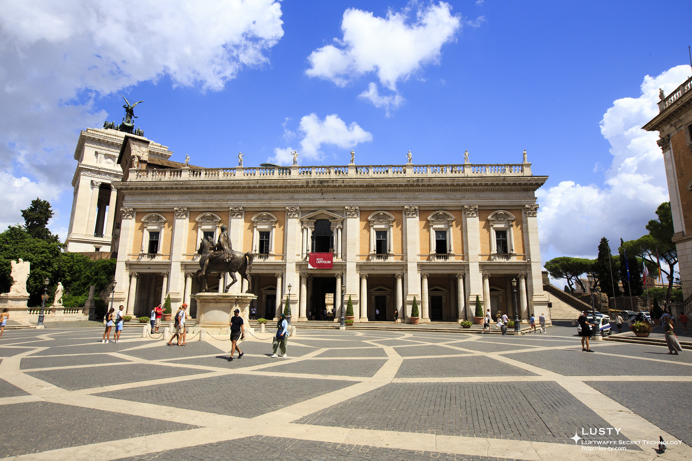 기마상 뒤로 서 있는 궁전은 세나토리오 궁전이다. 미켈란젤로가 디자인한 이중 계단과 정면의 모습이 조화롭다. 세나토리오 궁전은 1870년 로마가 이탈리아 왕국에 합병될 때까지 로마 원로원 의 소재지였으며 세나토리오 궁전의 이름은 상원 의원이라는 의미로 붙여진 것이다. 현재는 로마 시청이 들어서 있다.