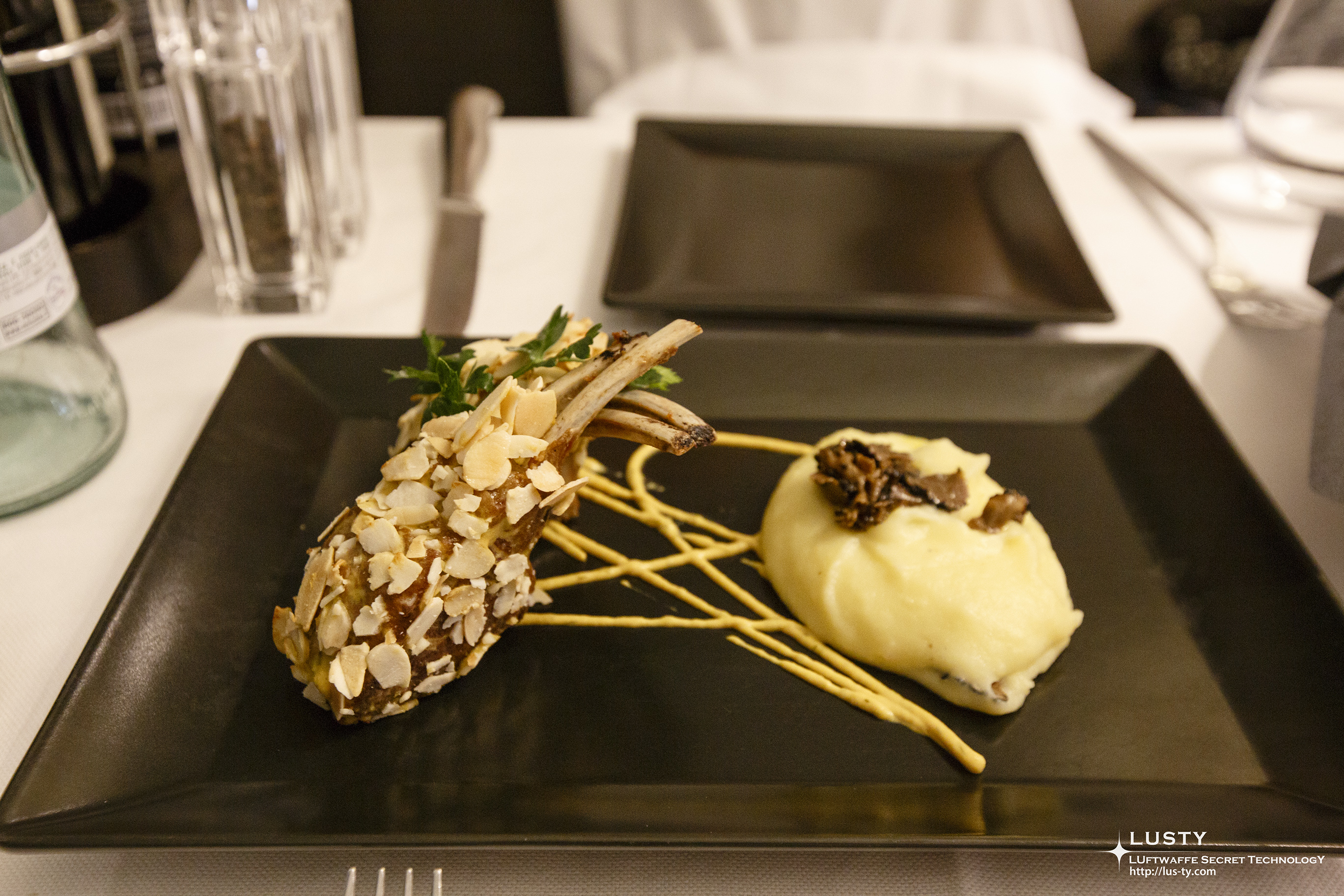 메인디쉬로 나온 양갈비. 겉을 아몬드로 감싸고 메시포테이토와 같이 먹을 수 있게 되어 있었다.