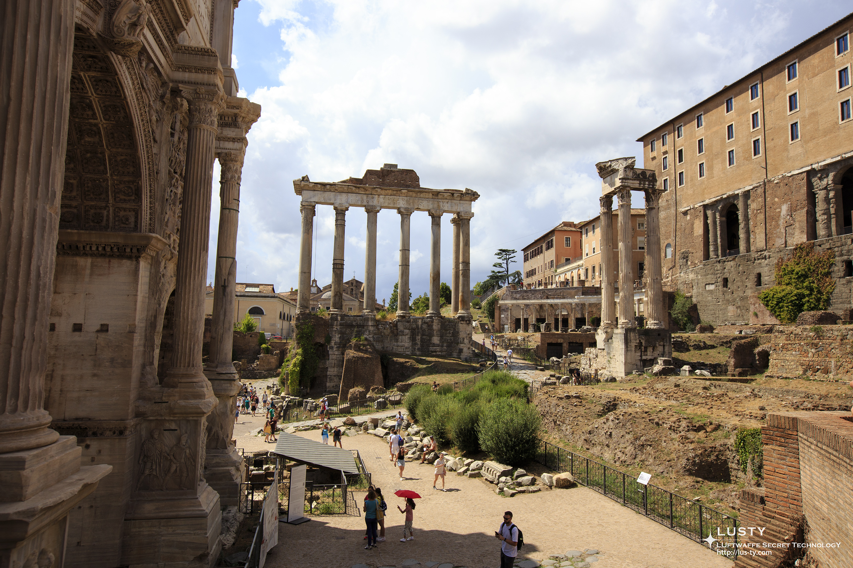 오른쪽에 있는 기둥들은 사투르누스 신전의 한쪽 벽인데, 농경의 신 사투르누스(영어로는 새턴)를 위한 신전으로 현재 남아있는 잔해는 여덟 개의 기둥 뿐이다. 신전은 종교적인 건축물로 기능하는데 그치지 않고 로마 사회에서의 은행 역할도 겸하는 곳이었다고 한다.