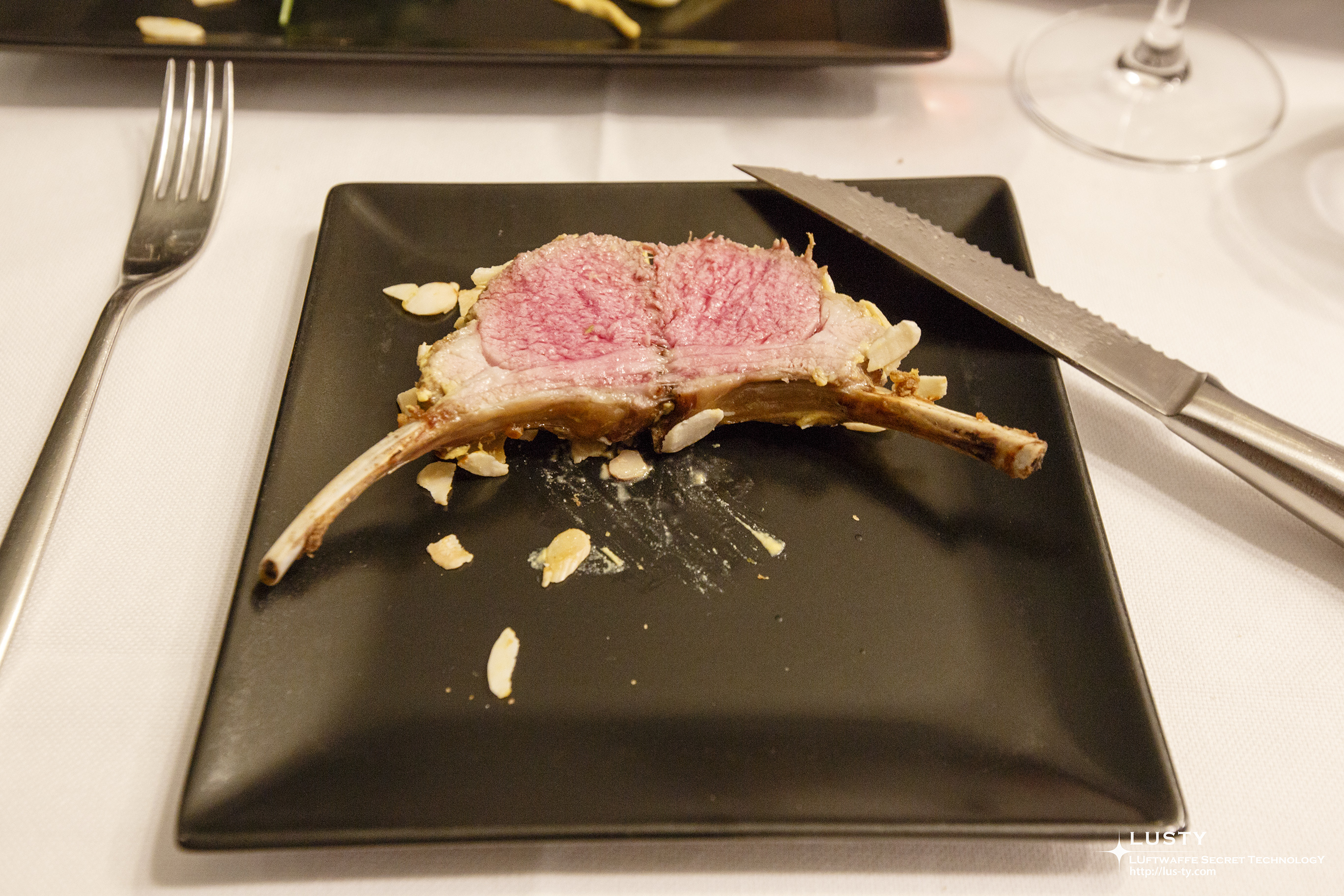 메인디쉬로 나온 양갈비. 겉을 아몬드로 감싸고 메시포테이토와 같이 먹을 수 있게 되어 있었다.