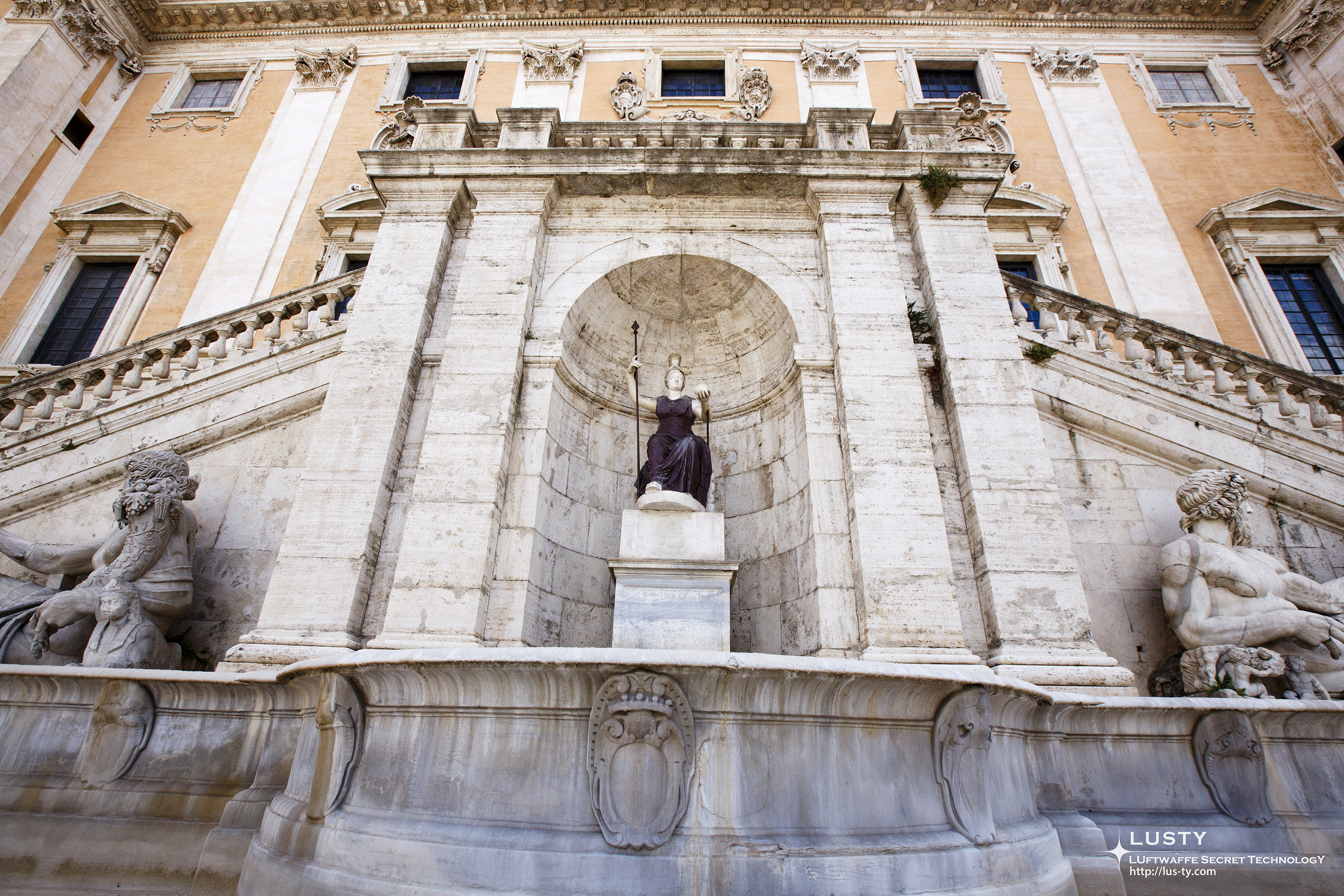 기마상 뒤로 서 있는 궁전은 세나토리오 궁전이다. 미켈란젤로가 디자인한 이중 계단과 정면의 모습이 조화롭다. 세나토리오 궁전은 1870년 로마가 이탈리아 왕국에 합병될 때까지 로마 원로원 의 소재지였으며 세나토리오 궁전의 이름은 상원 의원이라는 의미로 붙여진 것이다. 현재는 로마 시청이 들어서 있다.