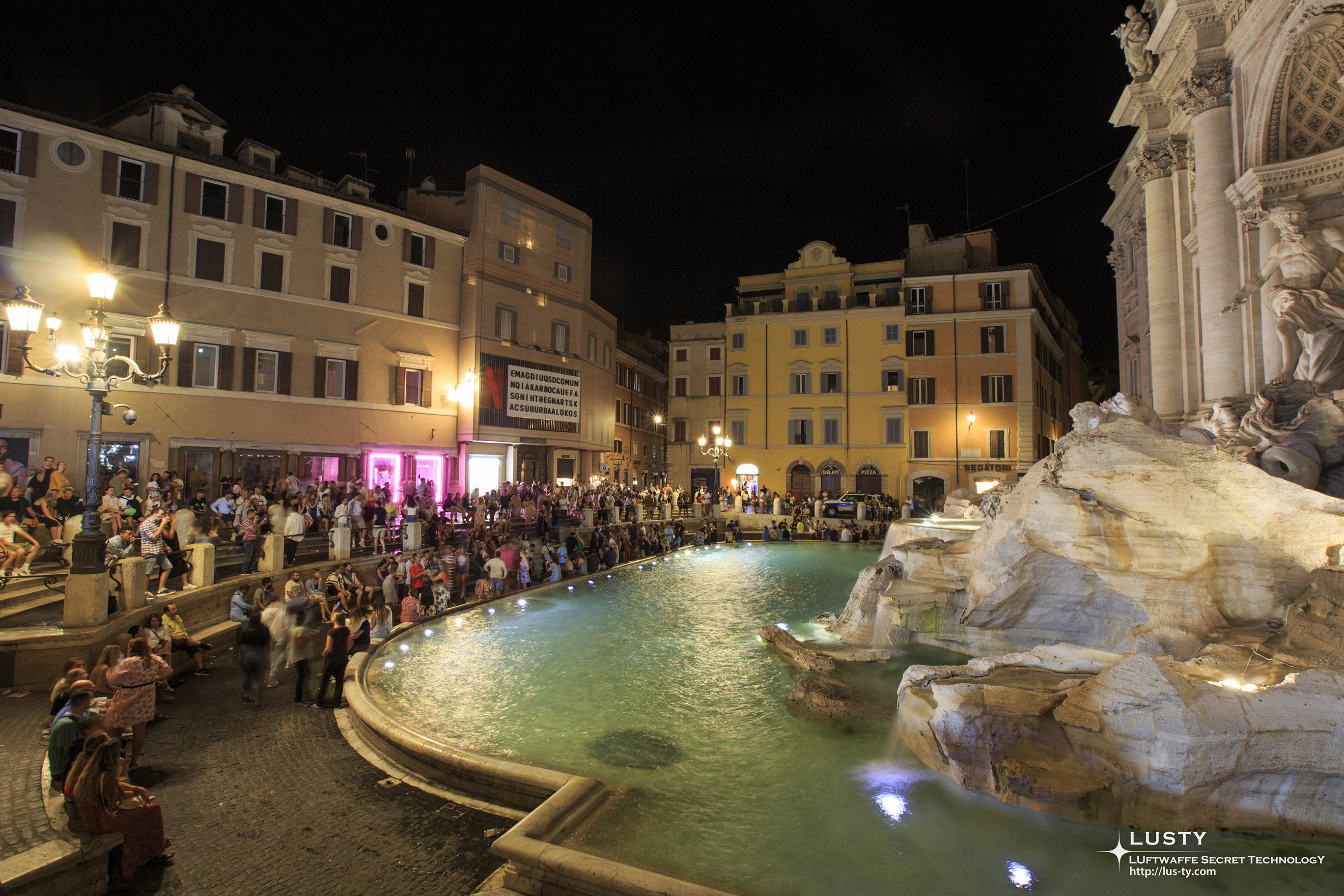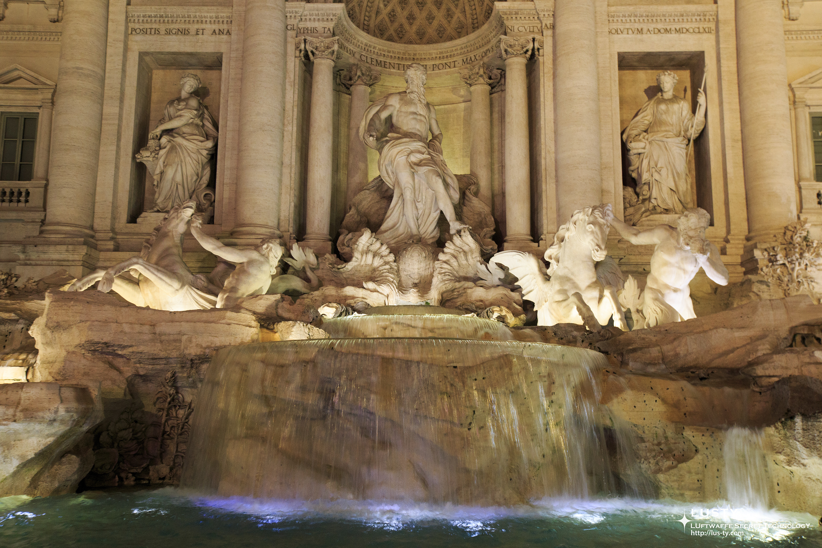 조명을 받아 낮과는 상당히 다른 느낌을 뿜어내는 트레비 분수.